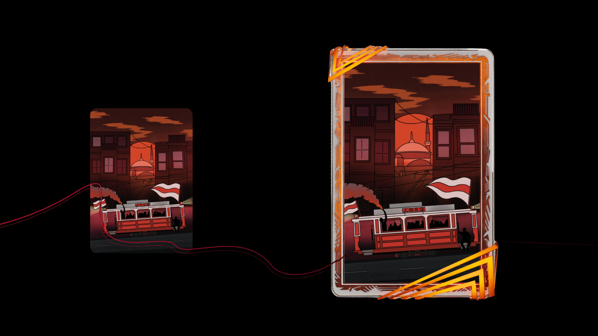 Die Illustration zeigt die Reise der weiß-roten Fans nach Istanbul. In einer bis auf den letzten Platz gefüllten historischen Straßenbahn machen sie sich auf den Weg zum Europapokalabend bei Fenerbahçe Istanbul. Während die Abendsonne über der Stadt untergeht, taucht sie Istanbul bereits in die weiß-roten Farben des VfB Stuttgart.