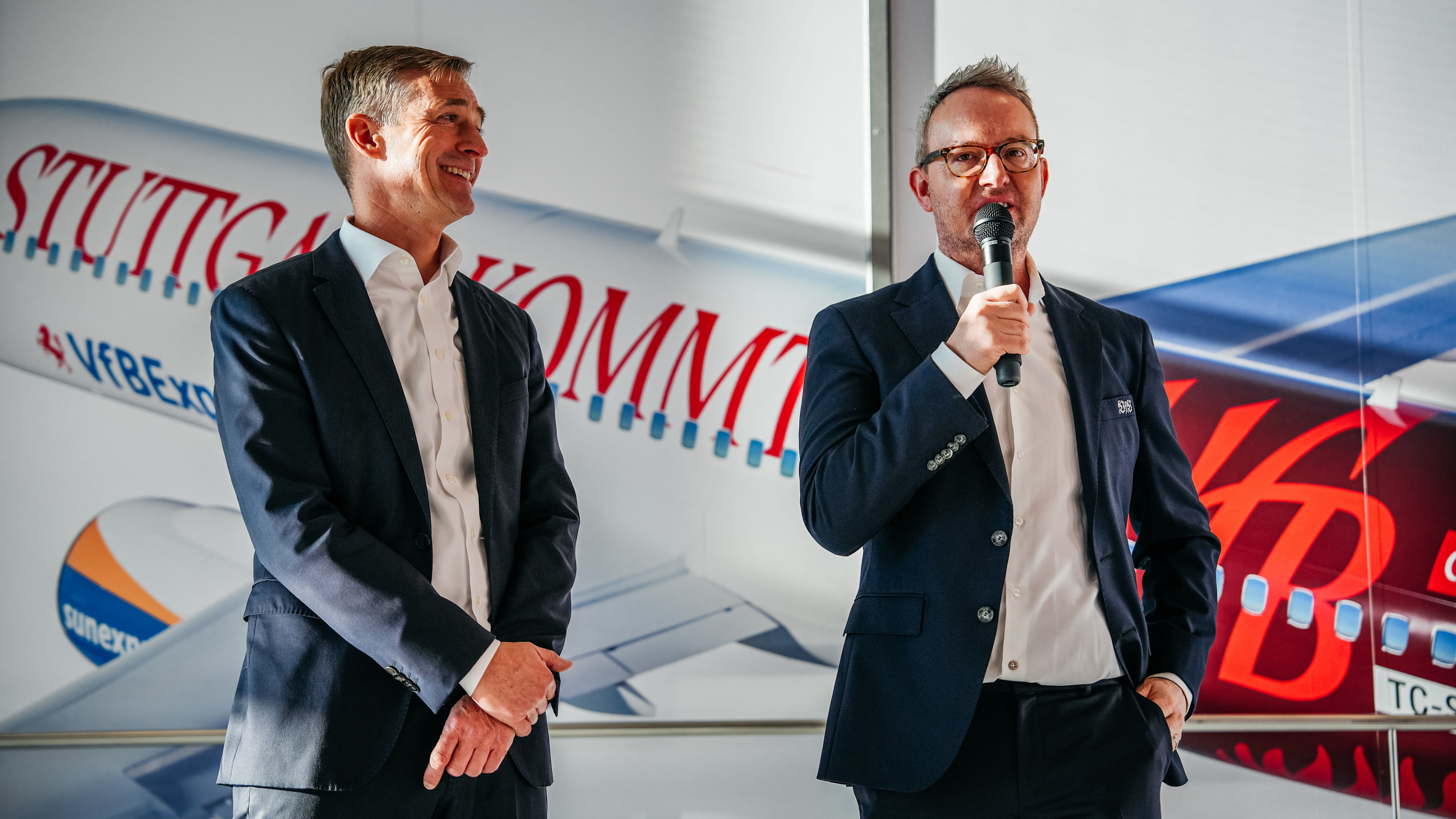 Der VfB-Vorstandsvorsitzende Alexander Wehrle, Max Kownatzki (CEO von SunExpress) und Ulrich Heppe (CEO Geschäftsführer Aviation der Flughafen Stuttgart GmbH und Sprecher der Geschäftsführung) feierten die Ankunft des Fliegers am Gate gemeinsam mit den VfB-Legenden Cacau, Timo Hildebrand und Maurizio Gaudino sowie zahlreichen Gästen und Partnern.