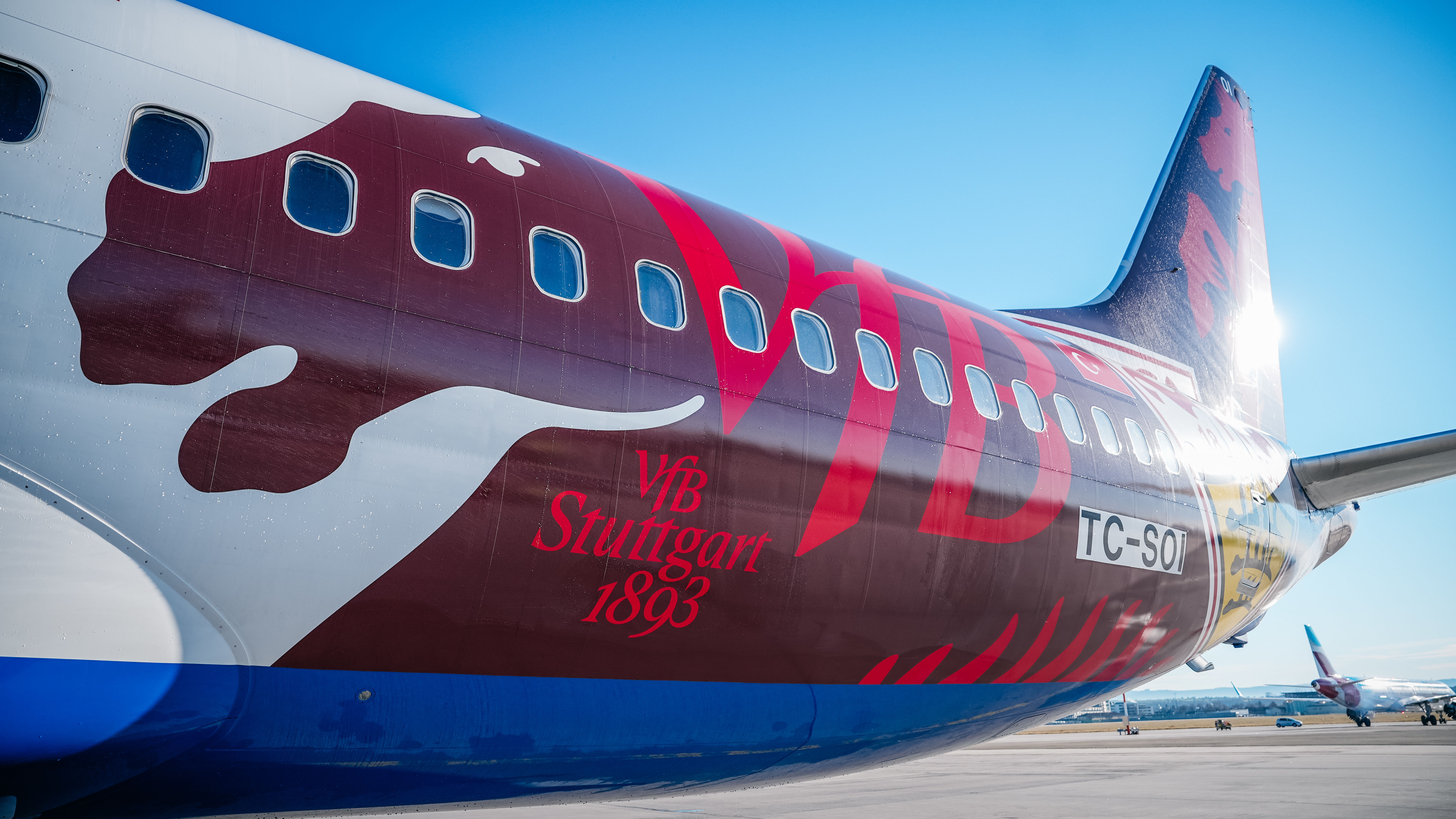Rund 100.000 VfB-Fans hatten im Herbst über das Design virtuell abgestimmt - nun ist es Realität: Am Montag ist der neue VfBExpress erstmals in Stuttgart gelandet. Das Flugzeug im Linienbetrieb von SunExpress, einem Joint Venture von Lufthansa und Turkish Airlines, wird künftig als fliegender Botschafter des Vereins und der Region unterwegs sein und ist ein Highlight der auf drei Jahre angelegten Partnerschaft zwischen SunExpress und dem VfB.