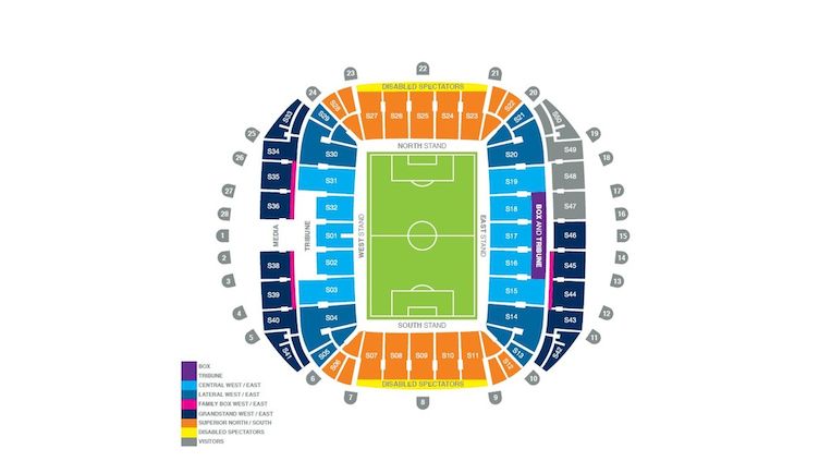 Der Gästeblock befindet sich im Südosten des Stadions in den Blöcken S48, S49 und S50 (zusammenhängend).
