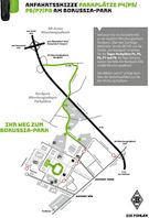 PKW: Stadionparkplätze P4 bis P8 (gemischt). Adresse: Am Nordpark 400, 41179 Mönchengladbach. Anreise über BAB 61, AS MG-Nordpark. Parkgebühr: 7 €.