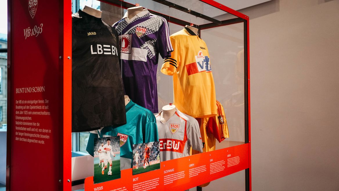 Die Ausstellung „Ein Trikot schreibt Geschichte“, die derzeit kostenfrei im „Schauspiel Stuttgart“ besucht werden kann, gliedert sich in verschiedene Themenbereiche. In der Vitrine „Farbe“ geht’s entsprechend bunt zu. In ihr wird dargestellt, was neben Weiß und Rot bereits für den Farbton auf dem Trikot sorgte.