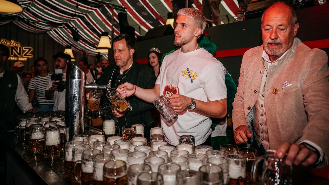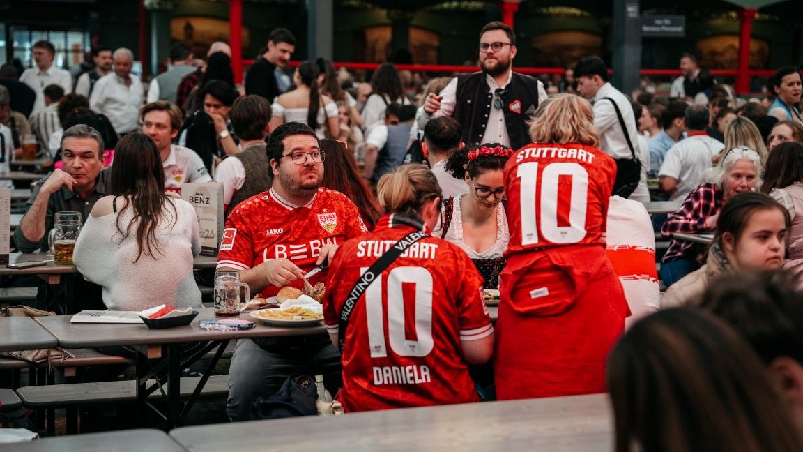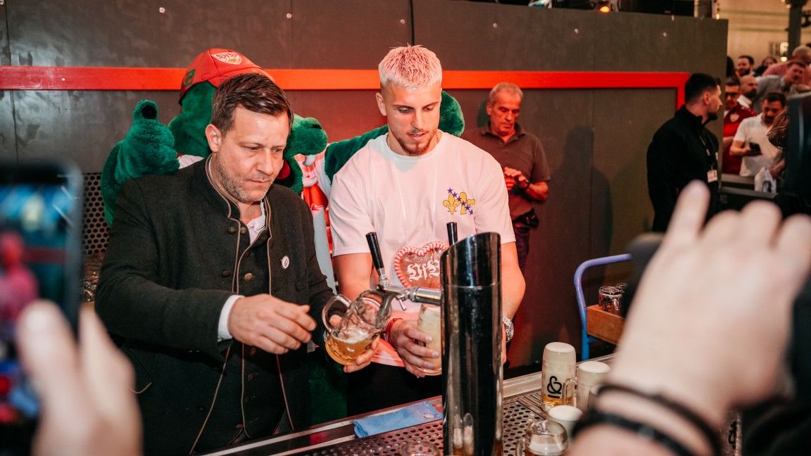 Auch beim diesjährigen „weiß-roten Frühlingsfest“ gab es für die VfB-Familie wieder eine Reihe von Vorzügen zu genießen: Gegen Vorlage ihres Mitgliedsausweises erhielten alle „Dunkelroten“ zwei Maß zum Preis von einer. Doch nicht nur das: Ermedin Demirovic hielt sein Versprechen ein und schenkte anlässlich der gelungenen Qualifikation zur Weltmeisterschaft rund eine Stunde lang Freibier für die VfB-Familie aus. „Die WM-Qualifikation war und ist eines der schönsten Dinge, die ich jemals erlebt habe. Jeder weiß mittlerweile, was es unserem Land Bosnien und Herzegowina bedeutet, dabei zu sein. Und deswegen gebe ich euch heute einen aus“, so der Stürmer zu Beginn seiner „Schicht“, die anschließend mit dem Anstich des Fasses auf der Bühne begann und das „weiß-rote Frühlingsfest“ endgültig einläutete.