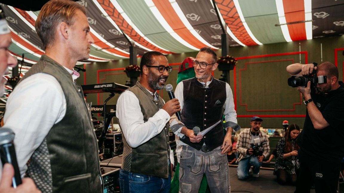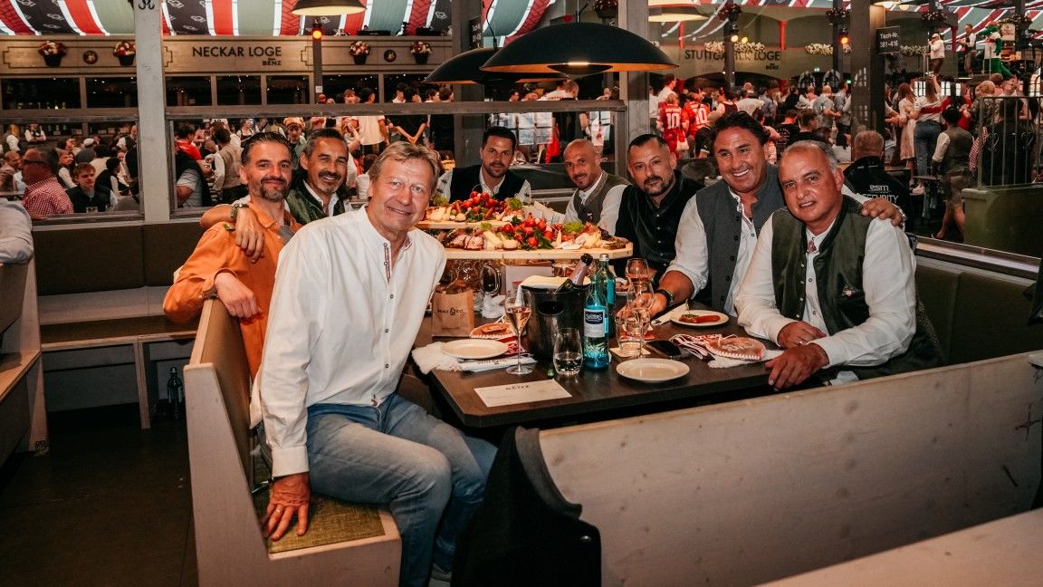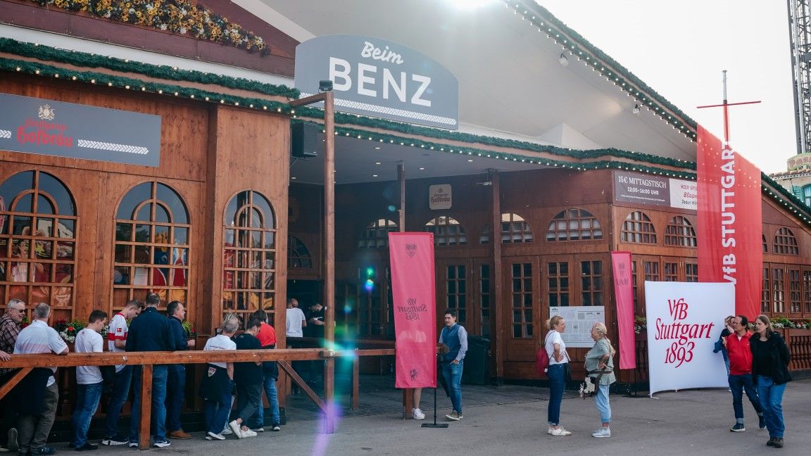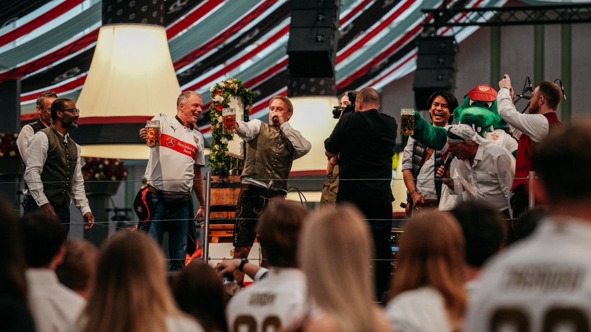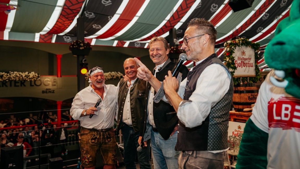 Stadionsprecher Holger Laser und „Hofnarr Luigi“, eine feste Institution im „Beim BENZ – Das Hofbräu Zelt“, führten gewohnt gesellig durch das abwechslungsreiche Bühnenprogramm, das neben musikalischen Einlagen auch Talks mit den Markenbotschaftern sowie das traditionelle Maßkrug-Stemmen vorsah. Bei diesem duellierten sich Timo Hildebrand und Cacau mit Fans und Maskottchen Fritzle, während Hansi Müller und Guido Buchwald einen Ausblick auf die im Sommer anstehenden Spiele der VfB Legends wagten. „Wir freuen uns auf den Sommer und darauf, den VfB im Ländle zu vertreten. Wir sind zwar nicht mehr die schnellsten, aber der Ball ist nach wie vor unser Freund“, so Guido Buchwald.