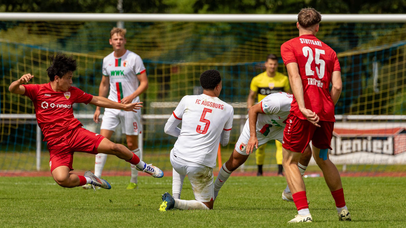 Es war noch keine Minute gespielt, da rauschte ein Schuss von Benjamin Boakye knapp am langen Pfosten vorbei. Auf der anderen Seite wurde es vor dem Tor von Finn Böhmker bei einer flachen Hereingabe gefährlich (3. Minute). Der VfB-Keeper musste nach acht Minuten eingreifen und einen Distanzschuss um den Pfosten lenken. Nach einer Viertelstunde lag der Ball dann im Tor des FCA. Eine Flanke bugsierte ein Augsburger vor dem einschussbereiten Efe Korkut zum 1:0 ins eigene Tor. Ein Schuss der Augsburger entschärfte Finn Böhmker in Minute 27, kurz vor der Halbzeitpause fiel dann doch der Ausgleich. Nach einem langen Ball erzielte Juan Caberera das 1:1.