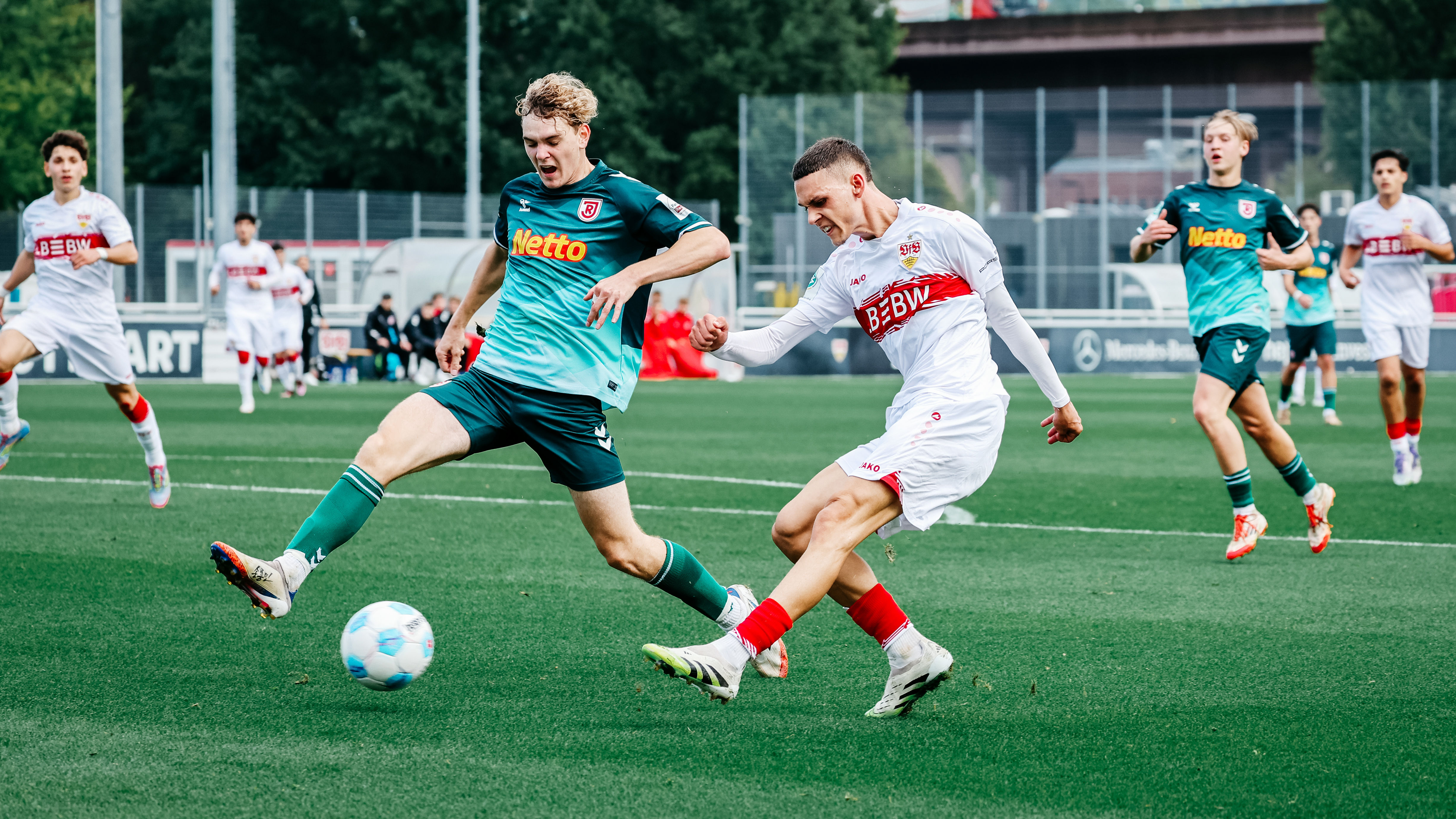 Zweimal Flanke Nikolas Matic, zweimal Kopfball Enis Redzepi – das war das Erfolgsrezept der U19 am vergangenen Samstag. Beim Heimspiel gegen den SSV Jahn Regensburg tat sich das Team von Trainer Tobias Rathgeb allerdings lange schwer. Trotz großer Dominanz wollte das Führungstor für die Jungs aus Cannstatt nicht fallen, stattdessen gingen die Gäste in Minute 27 durch Fabian Hanula nach einem Fehlpass im Stuttgarter Spielaufbau in Führung.