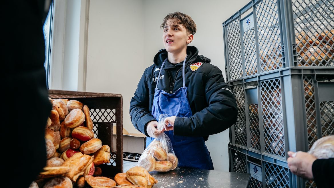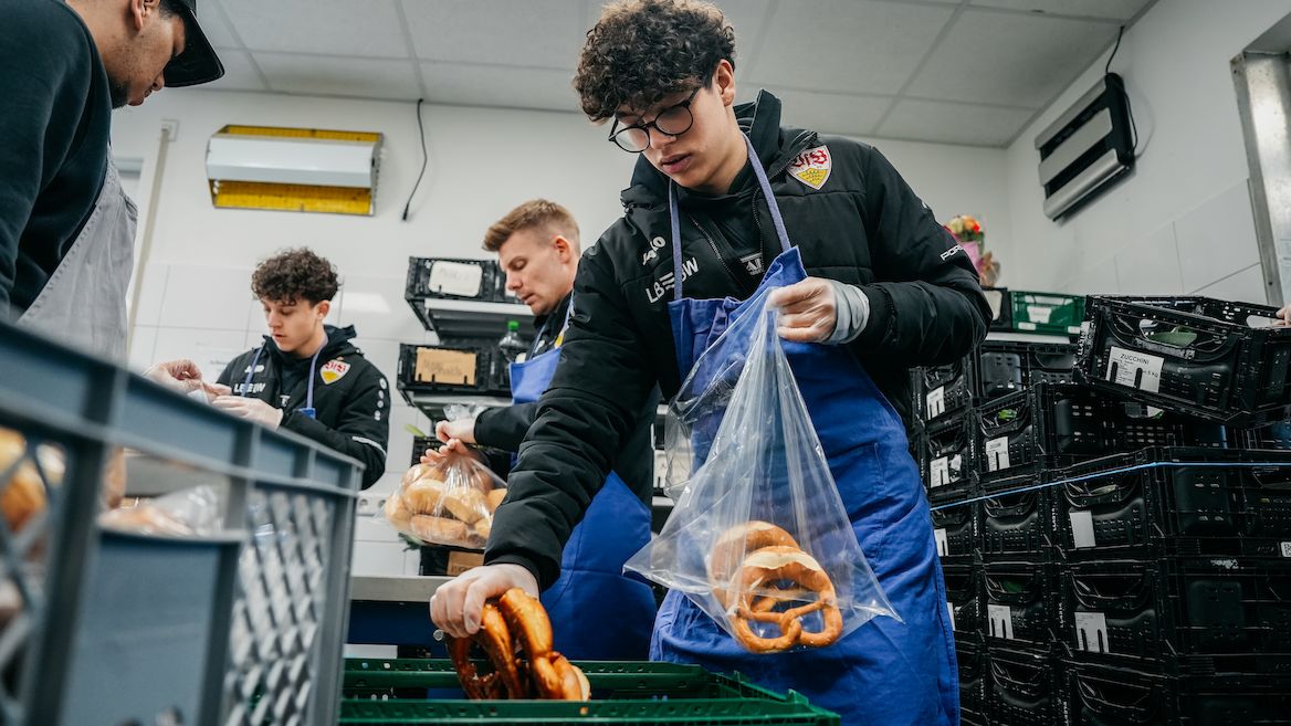 Jede VfB-Nachwuchsmannschaft hat die Aufgabe, in jeder Saison mindestens eine soziale Aktivität durchzuführen. Die Zusammenarbeit mit der Schwäbischen Tafel ist ein gewachsenes Projekt, der VfB ist bereits seit mehreren Jahren regelmäßig mit seinen Jugendmannschaften als Helfer zu Gast. „Die Jungs lernen den verantwortungsvollen Umgang mit Lebensmitteln, die noch gut verwertbar sind, und tun gleichzeitig auch der Allgemeinheit etwas Gutes“, sagt U15-Trainer Mathias Urbani. „Wir wollen jede Chance nutzen, aus der Bubble Fußball auszubrechen und andere Lebensrealitäten kennenzulernen, um die Jungs in ihrer Persönlichkeit weiterzubringen.“ Die Persönlichkeitsentwicklung der Spieler genießt in der Jugendausbildung des VfB einen großen Stellenwert und ist neben Sport und Bildung eine der drei Säulen des Ausbildungskonzepts.