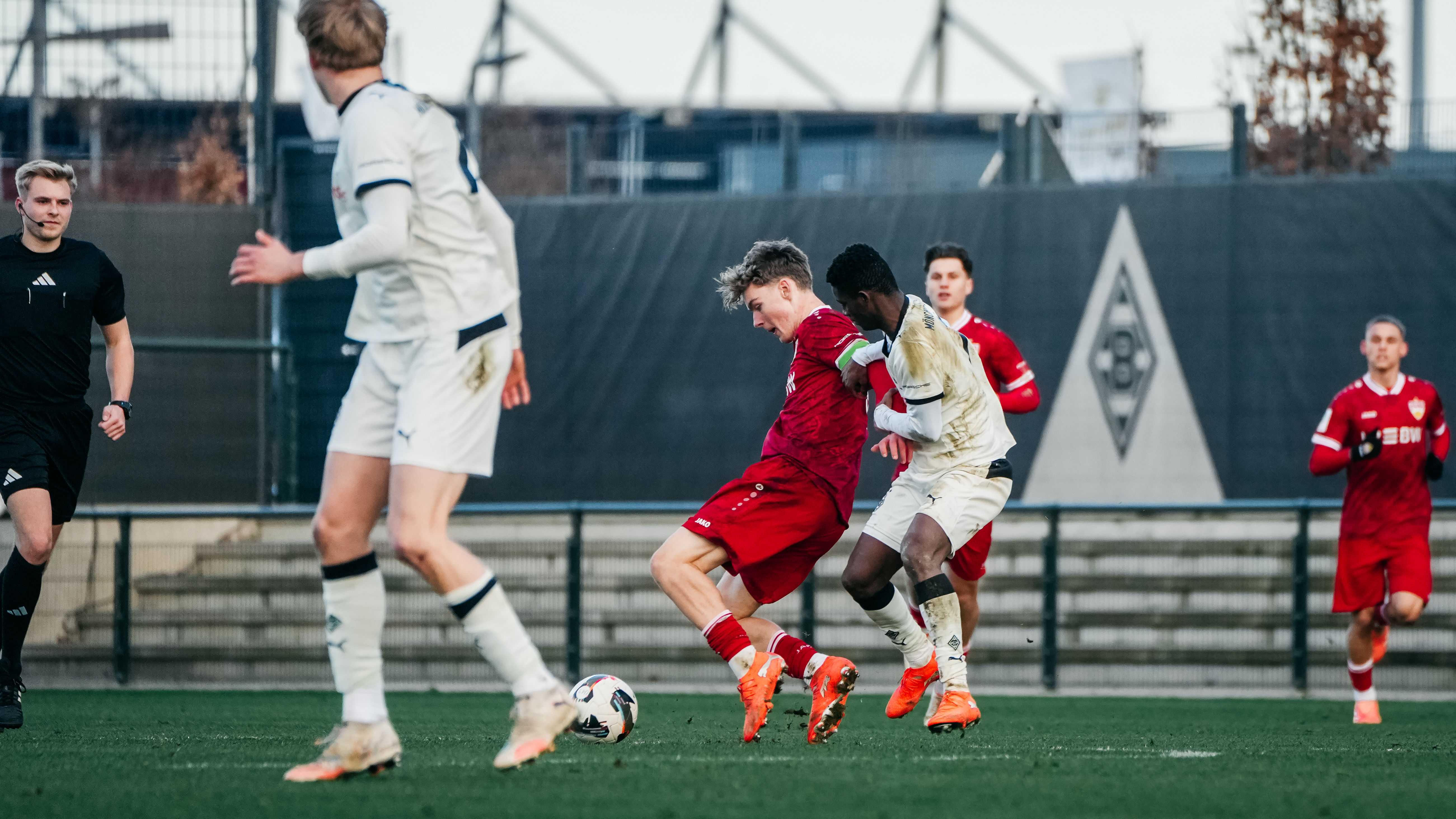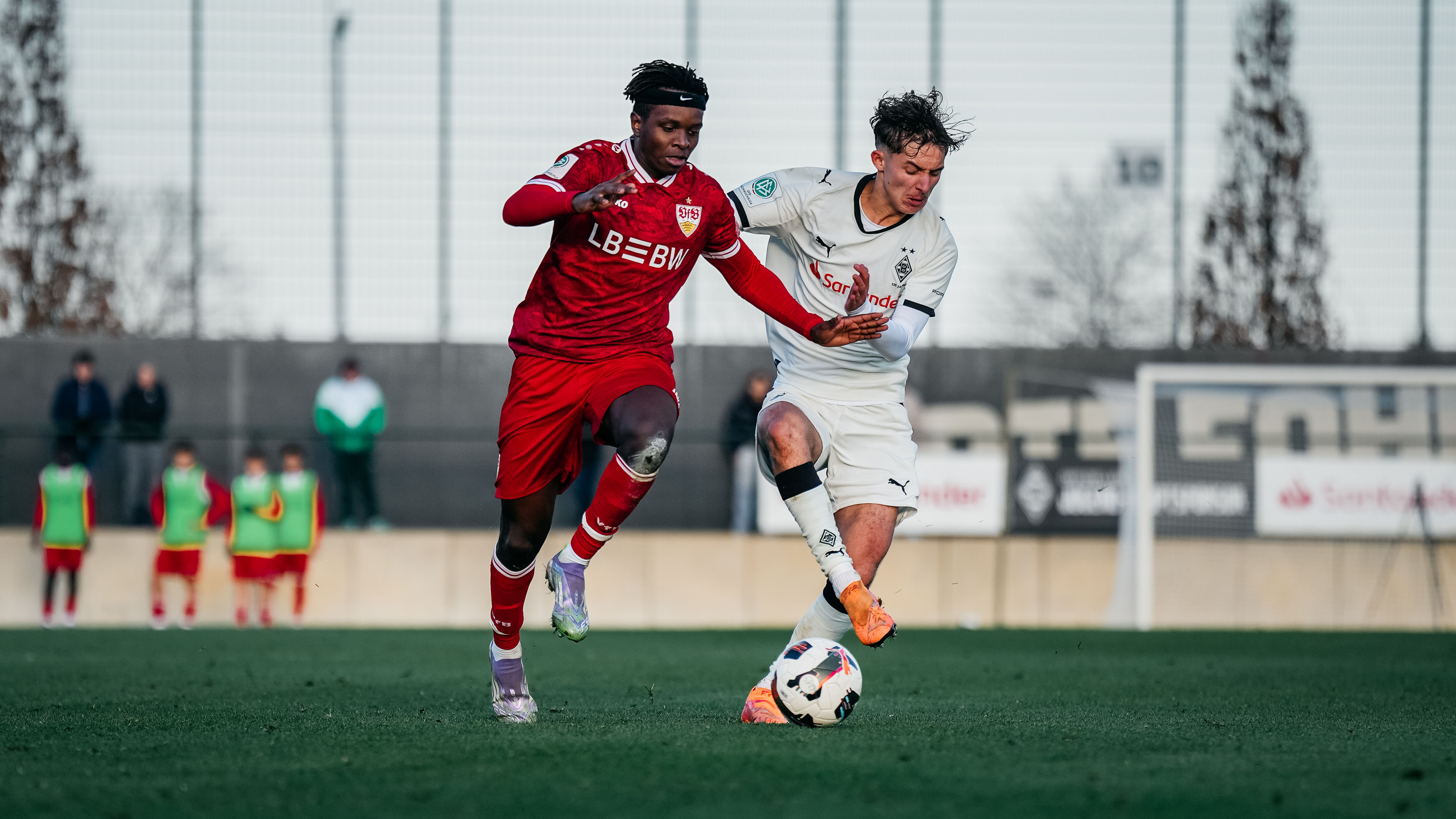 Ohne den angeschlagenen Ertugrul Yigit sowie Flügelstürmer Neno Zezelj und Außenverteidiger Nikolas Matic, die krankheitsbedingt fehlten, ging die U19 des VfB ersatzgeschwächt in das Viertelfinale des DFB-Pokals der Junioren bei Borussia Mönchengladbach. Der Start gehörte dennoch den Jungs aus Cannstatt: Nach guten Anfangsminuten brachte Matthaios Tsigkas seine Mannschaft mit 1:0 in Führung (siehe: Die Tore). Diese hatte allerdings nur neun Minuten Bestand, da Len Wörsdörfer mit der ersten echten Chance der Gastgeber direkt den Ausgleich erzielte. Dies war die Initialzündung der Borussia, die von nun an die bessere Mannschaft war und in Minute 29 mit dem 2:1 durch Niko Horvat das Spiel komplett drehte. In der Folge hatte der VfB Glück, dass die Hausherren drei gute Chancen auf das 3:1 liegen ließen oder damit an Ioannis Kechlimparis oder an der Latte scheiterten. In Minute 42 zeigte sich das Team von Trainer Tobias Rathgeb mit einem abgefälschten Fernschuss von Enis Redzepi wieder gefährlich in der Offensive, zum Ausgleich kamen die Jungs mit dem Brustring allerdings nicht mehr. So ging es mit dem 2:1 in die Pause.