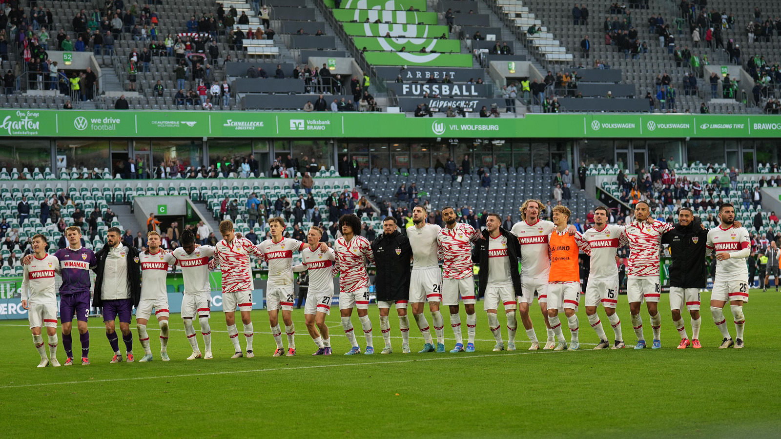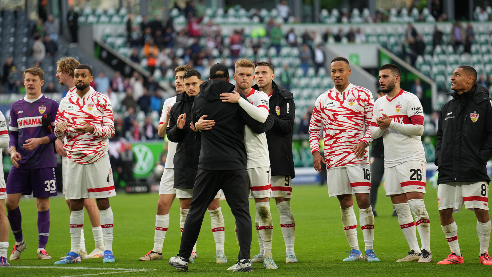 Bei 70 Prozent Ballbesitz und 17 Torschüssen auf das gegnerische Gehäuse (Wolfsburg: fünf) sprach statistisch am Samstagnachmittag vieles für den VfB. Am Ende nimmt die Mannschaft mit dem roten Brustring durch die Treffer von Enzo Millot (32.) und Deniz Undav (90. +7) einen Punkt mit nach Hause, der mehr als verdient war (Zum Spielbericht). So stellt sich die Frage nach einem Punktverlust oder Punktgewinn? Sportvorstand Fabian Wohlgemuth bewertet das Ergebnis als „Punkt der Moral“ und führt weiter aus: „Auch wenn wir ein bisschen was liegen gelassen, unglückliche Gegentore bekommen haben und heute vom Schiedsrichter benachteiligt wurden, haben wir uns den Punkt redlich verdient und erkämpft. Wir haben gezeigt, dass wir eine Einheit sind und weitere Entwicklungsschritte machen. Der Ausgleich in Unterzahl, in der Nachspielzeit zeigt, dass wir Moral, Bereitschaft und Zusammenhalt bewiesen haben.“