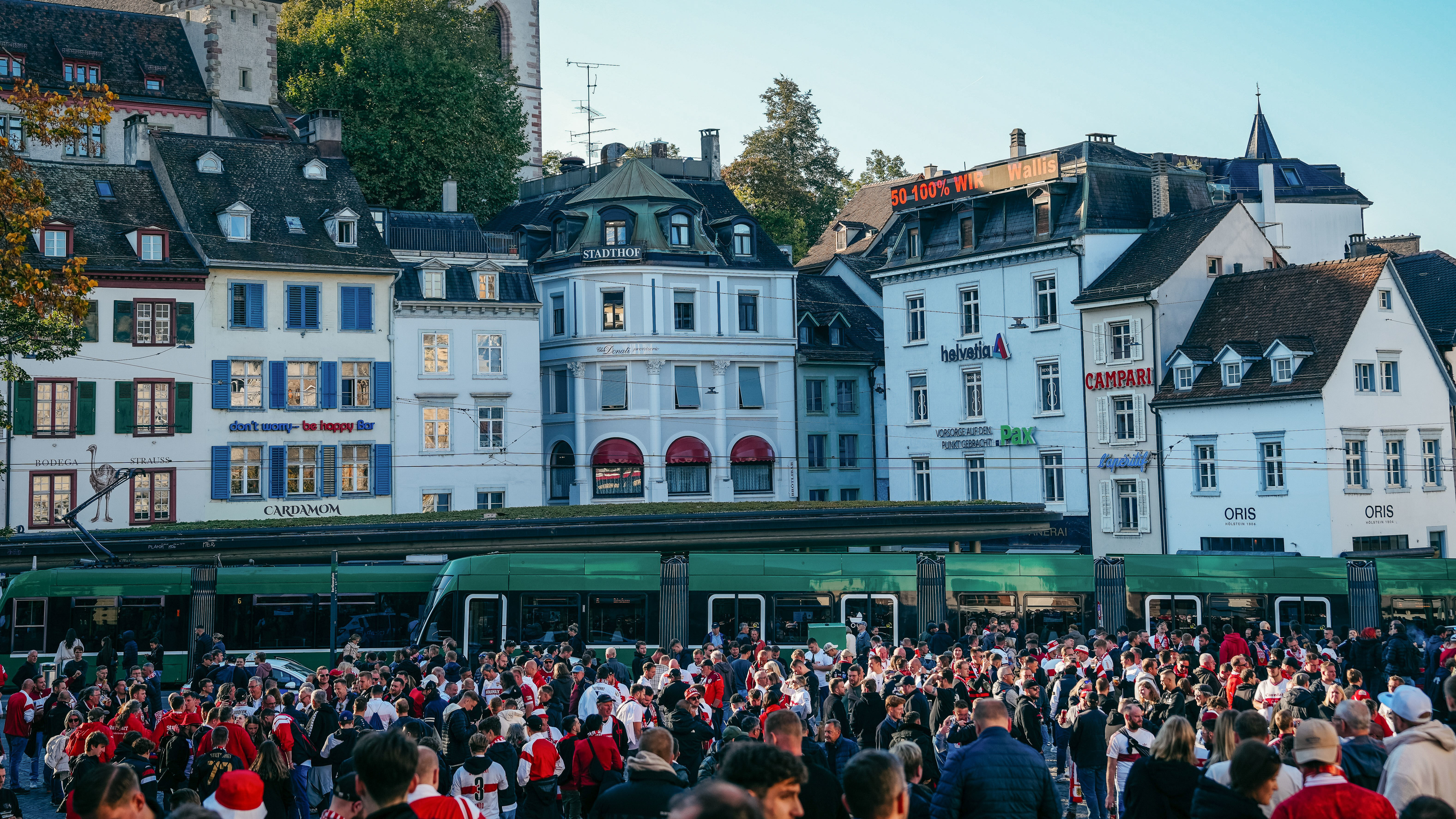 Viele Fans unterstützen den VfB in Basel, vor Ort prägen derzeit Weiß und Rot das Stadtbild, insbesondere rund um den Barfüsserplatz. Von dort aus setzt sich zeitnah auch der Fanmarsch in Bewegung, der pünktlich zur Stadionöffnung am St. Jakob-Park ankommen wird. Der Gästebereich ist restlos ausverkauft.