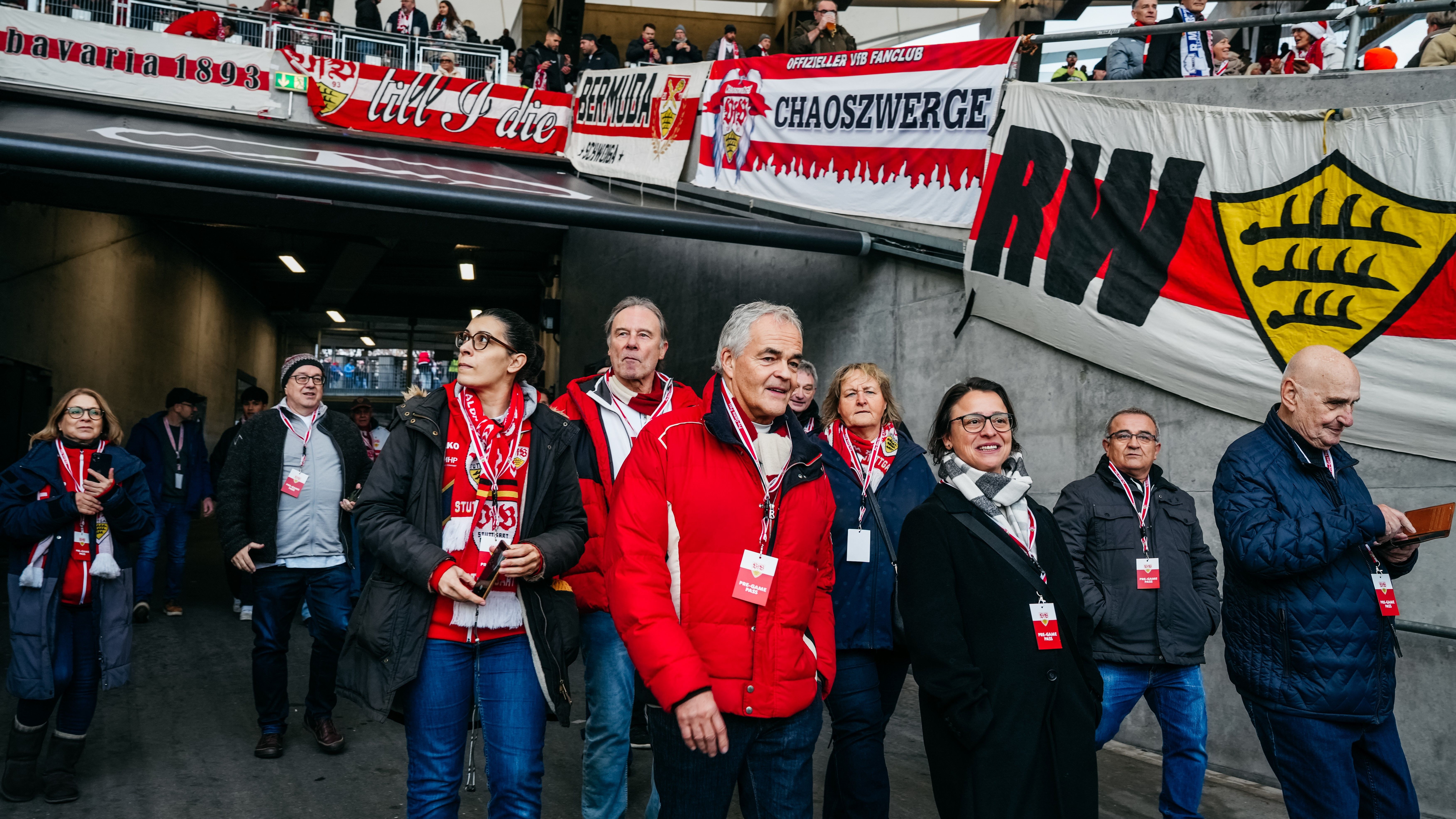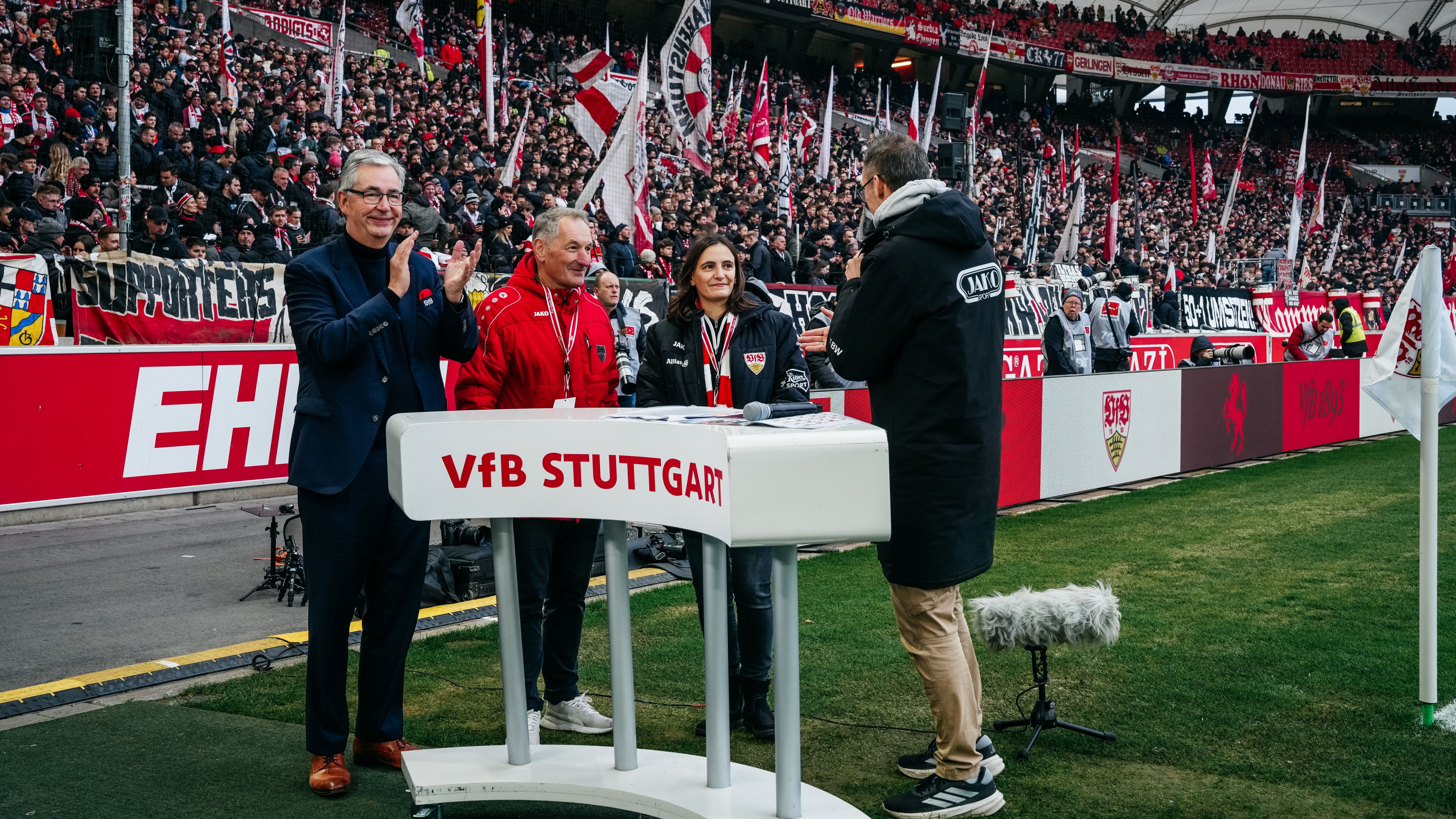 Besonders im Fokus standen somit rund 35 Ehrenamtliche aus den Vereinsabteilungen, die der VfB zu dem Bundesligaspiel am Samstagnachmittag gegen den FC Bayern München eingeladen hatte. Sie erlebten ein abwechslungsreiches Programm – unter anderem bestehend aus exklusiver Stadionführung, „Pre-Game-Pass“ mit unmittelbarer Nähe zum Warm-up der Profis und Treffen mit VfB-Legenden nach Abpfiff. Im Rahmen der Stadionshow fand zudem ein Talk mit Claudia Lopes (Koordinatorin Juniorinnen Frauenfußball), Bernhard Rössle (Faustball) sowie Präsident Dietmar Allgaier statt, der die zentrale Bedeutung freiwilliger Arbeit im Vereinsleben nochmals hervorhob.