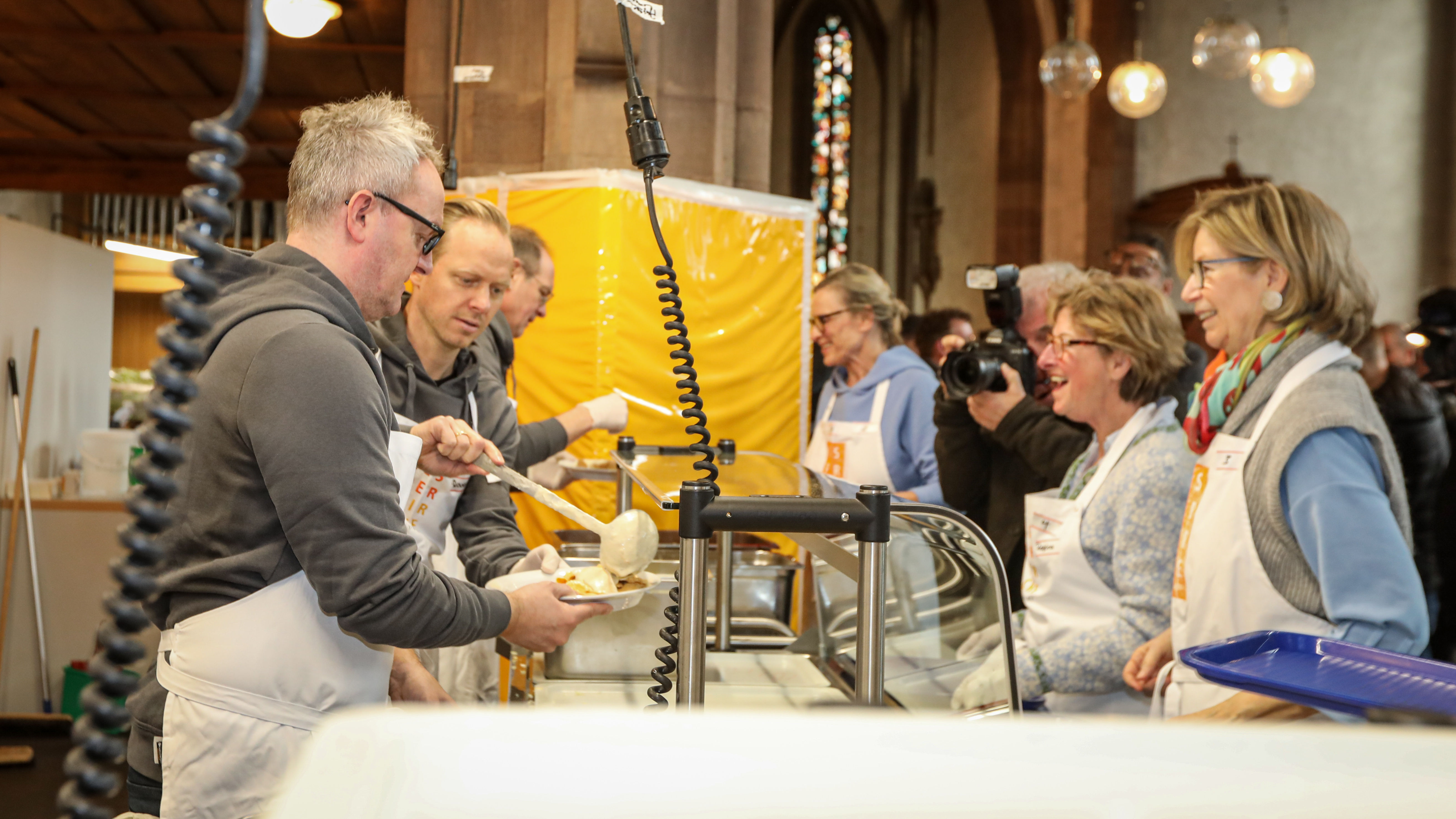 Die Vertreter des Profiteams, des Vorstand und des Präsidiums betraten die Vesperkirche hoch motiviert und gut gelaunt. Die Gelegenheit, sich persönlich mit den Menschen abseits des Fußballplatzes auszutauschen, zu Helfen und über den Tellerrand hinauszublicken wird jedes Jahr willkommen angenommen.