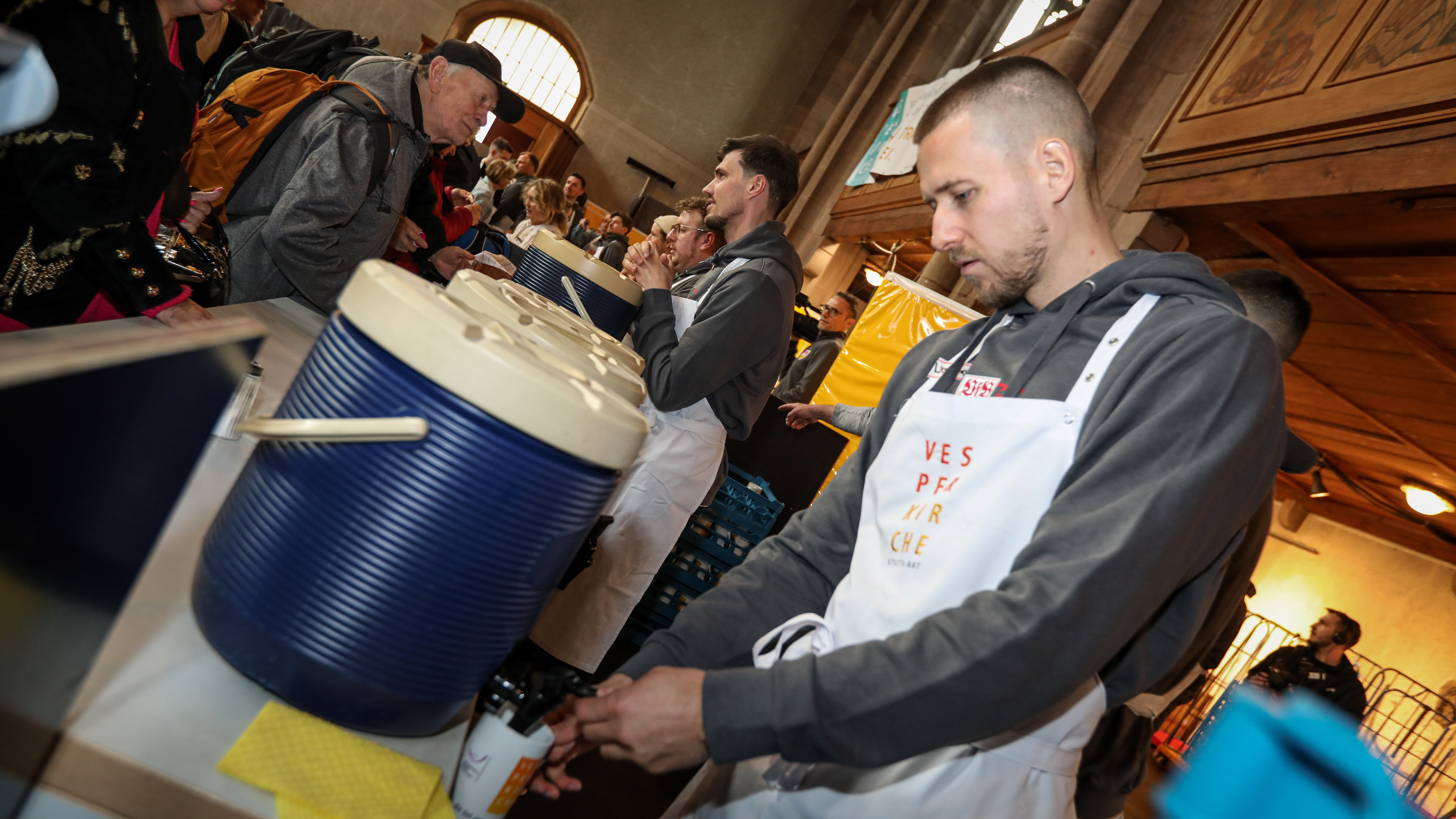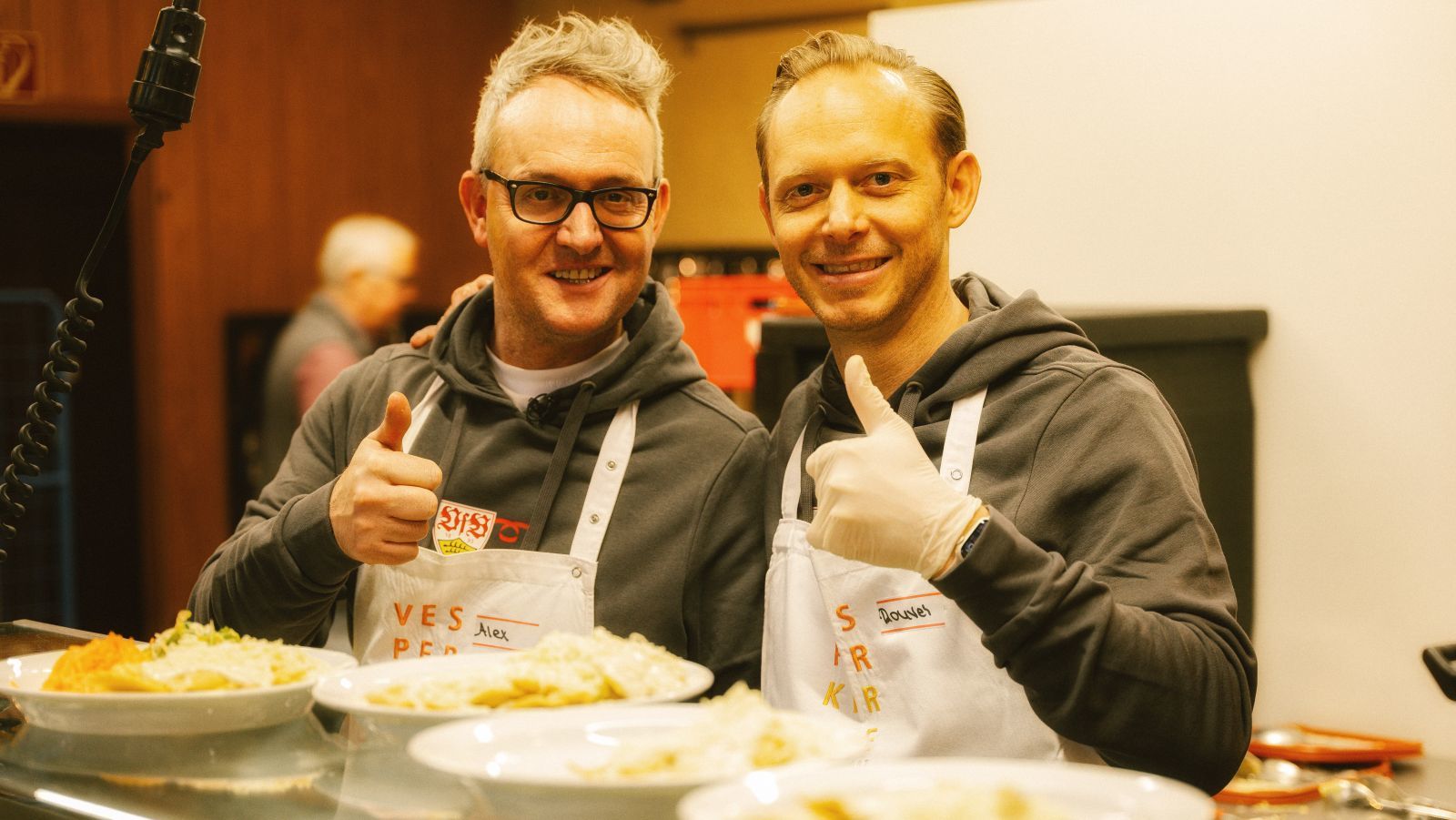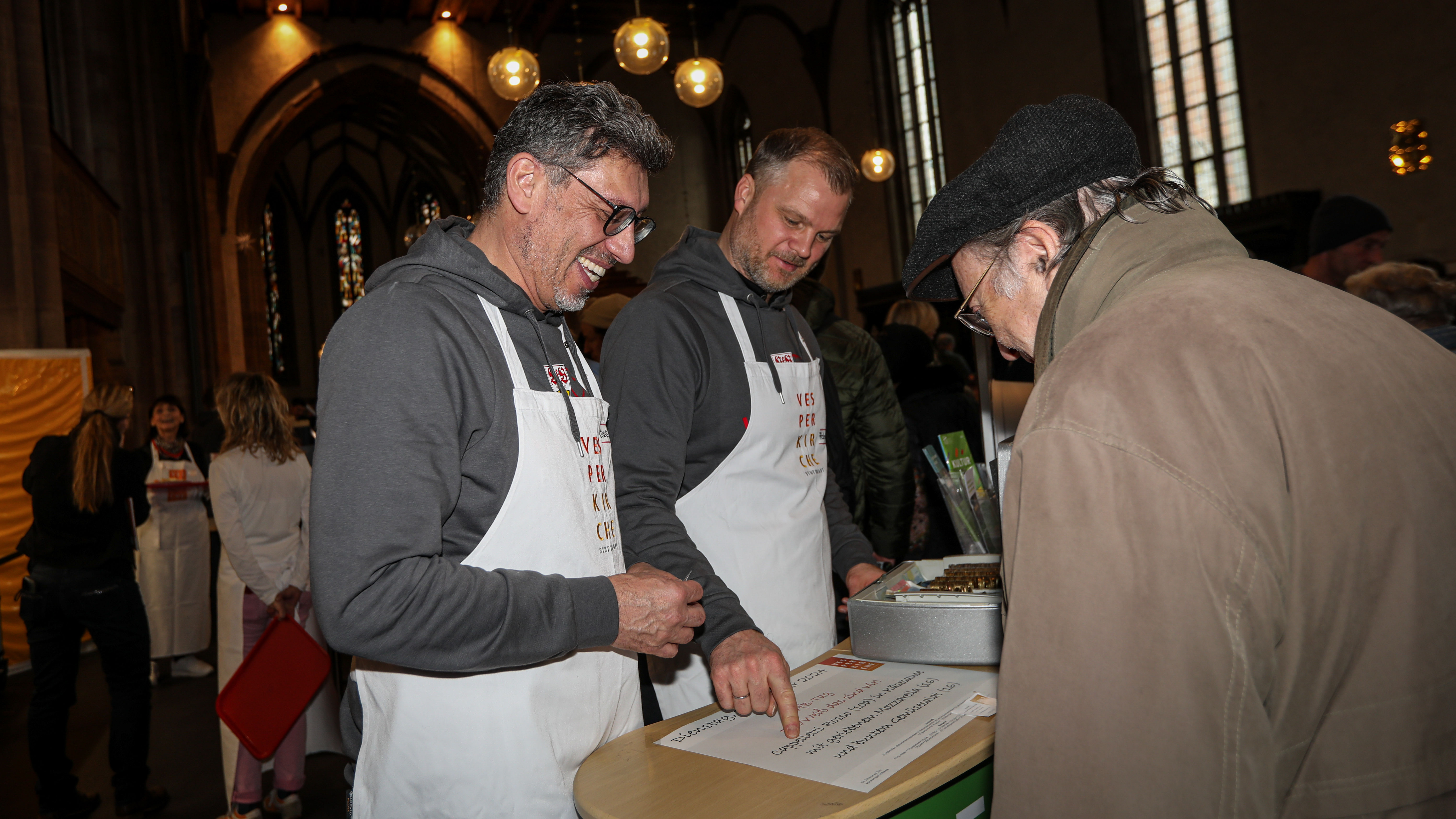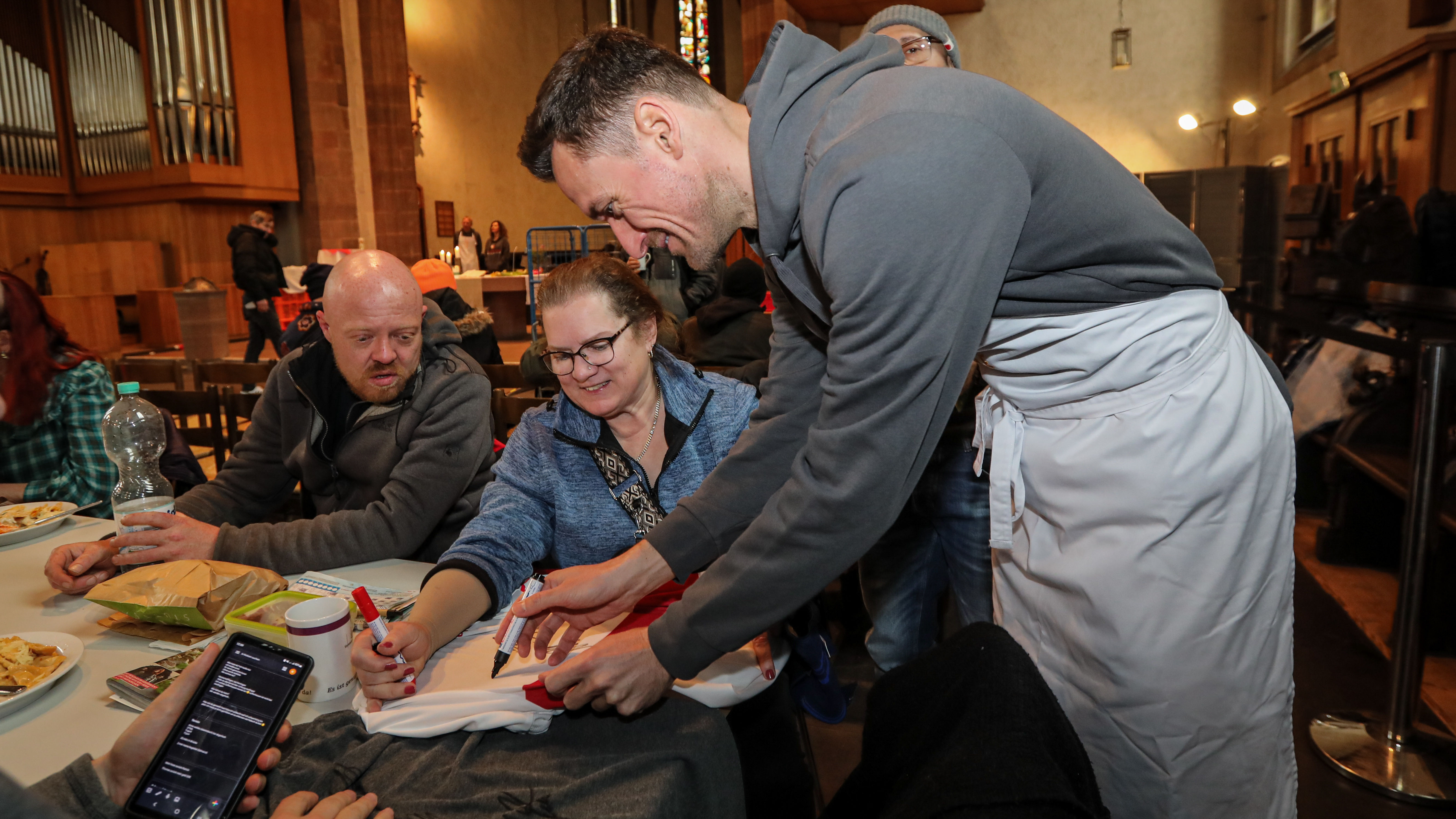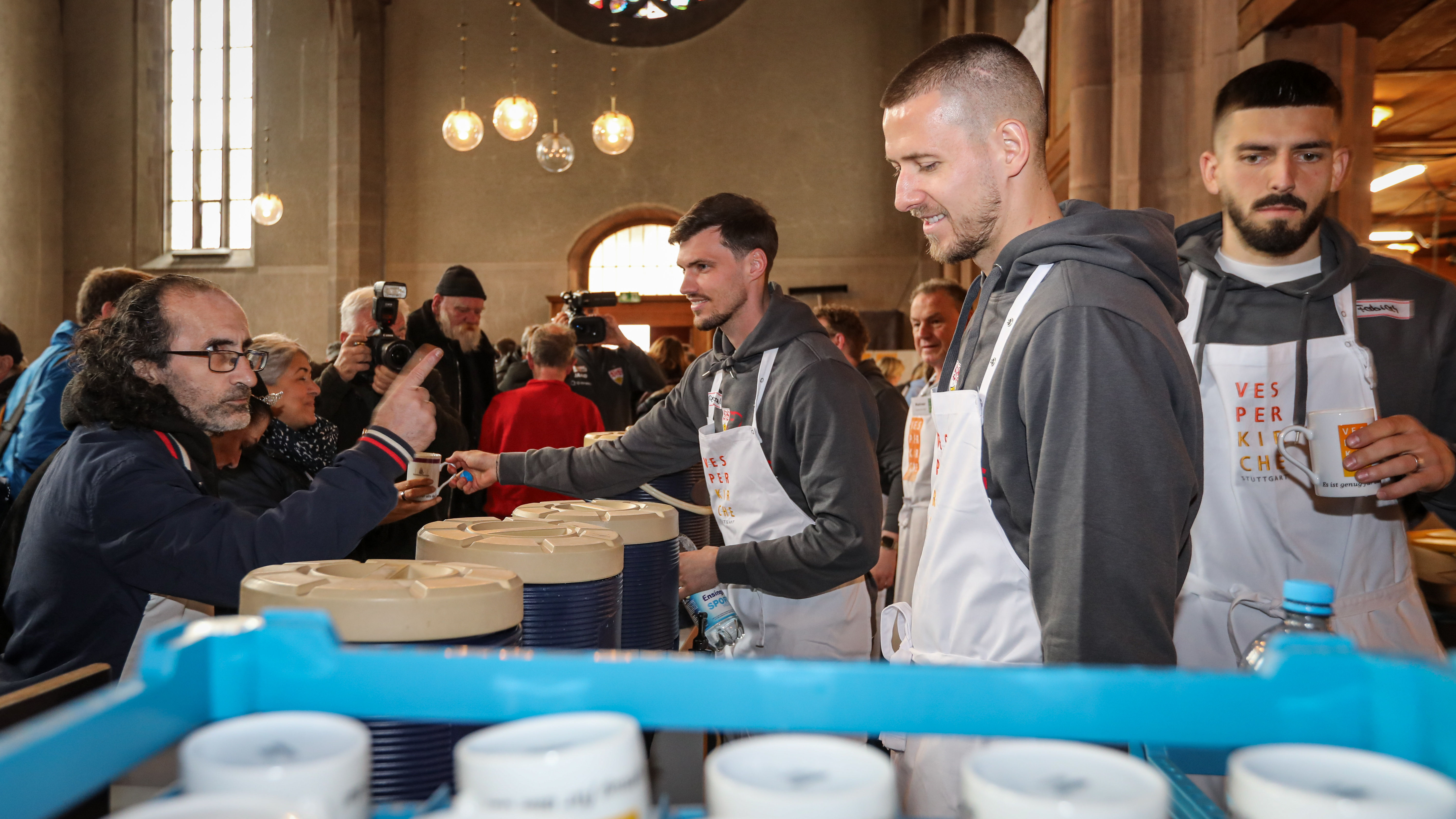 Während ihres Besuchs reichten die Spieler nicht nur Essen und Getränke, sondern sie setzten sich auch zu den Gästen, um sich mit ihnen zu unterhalten, Geschichten auszutauschen und einfach zuzuhören. Die Vesperkirche bietet dafür immer besondere Gelegenheiten für beide Seiten, um sich Zeit zu nehmen und zuzuhören.