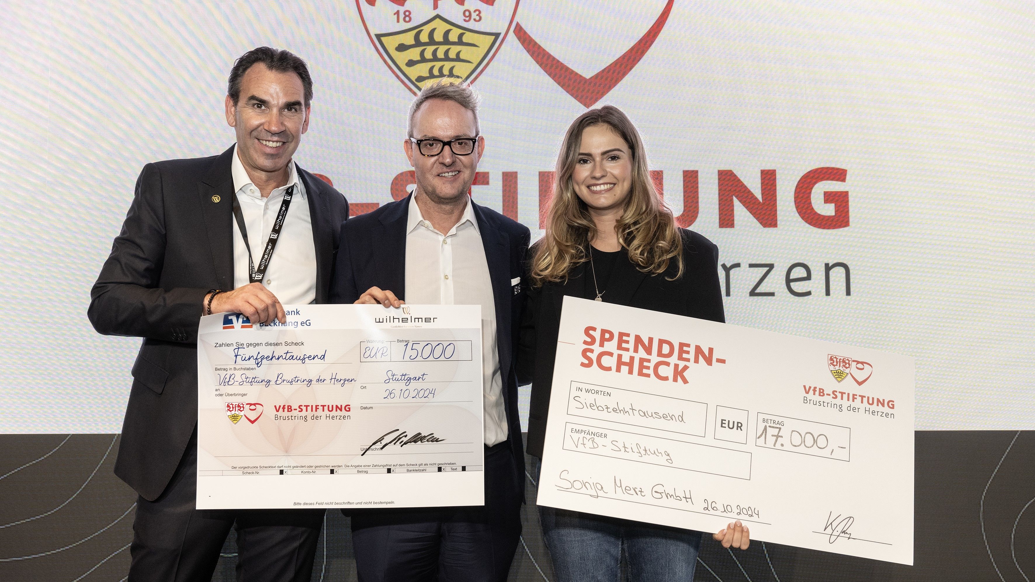 Auch bei dem Talk im Sportstudio stand die VfB-Stiftung im Fokus: Unter großem Applaus überreichten Michael Wilhelmer (Wilhelmer Gastronomie) und Katharina Renz (Sonja Merz Gastronomie) Spenden-Schecks für die VfB-Stiftung an Alexander Wehrle in Höhe von 15.000 und 17.000 Euro. Die Erlöse resultieren aus gemeinsamen Aktionen des VfB auf dem Weindorf und im „Zelt mit Herz“ auf dem Cannstatter Volksfest.