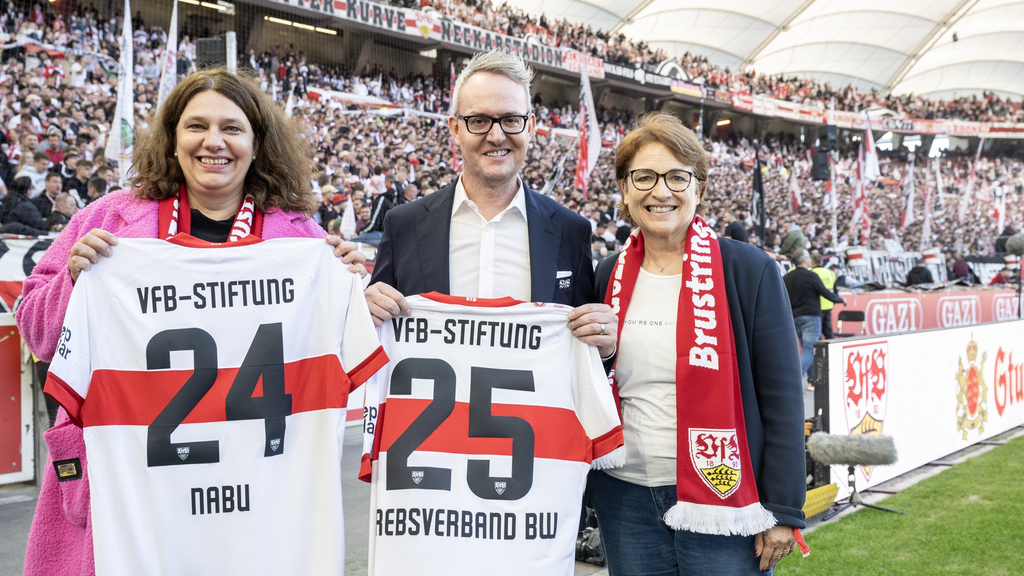 Ein symbolischer Moment folgte während der Stadionshow: Die VfB-Stiftung blickte mit bisherigen Jahreskooperationspartner NABU auf die Zusammenarbeit und übergab den Staffelstab an den Krebsverband Baden-Württemberg. NABU-Bundesgeschäftsführerin Susanne Baumann bedankte sich für viele gemeinsame Projekte wie das Fußball- und Naturschutzcamp, das „Sports and Development“-Programm in Kenia und die Kooperation bei der Gestaltung des Naturlehrpfades am VfB-Trainingsgelände. Ulrika Gebhardt, Geschäftsführerin des Krebsverbandes Baden-Württemberg, blickte erwartungsvoll auf die bevorstehende Partnerschaft mit der VfB-Stiftung im kommenden Jahr.