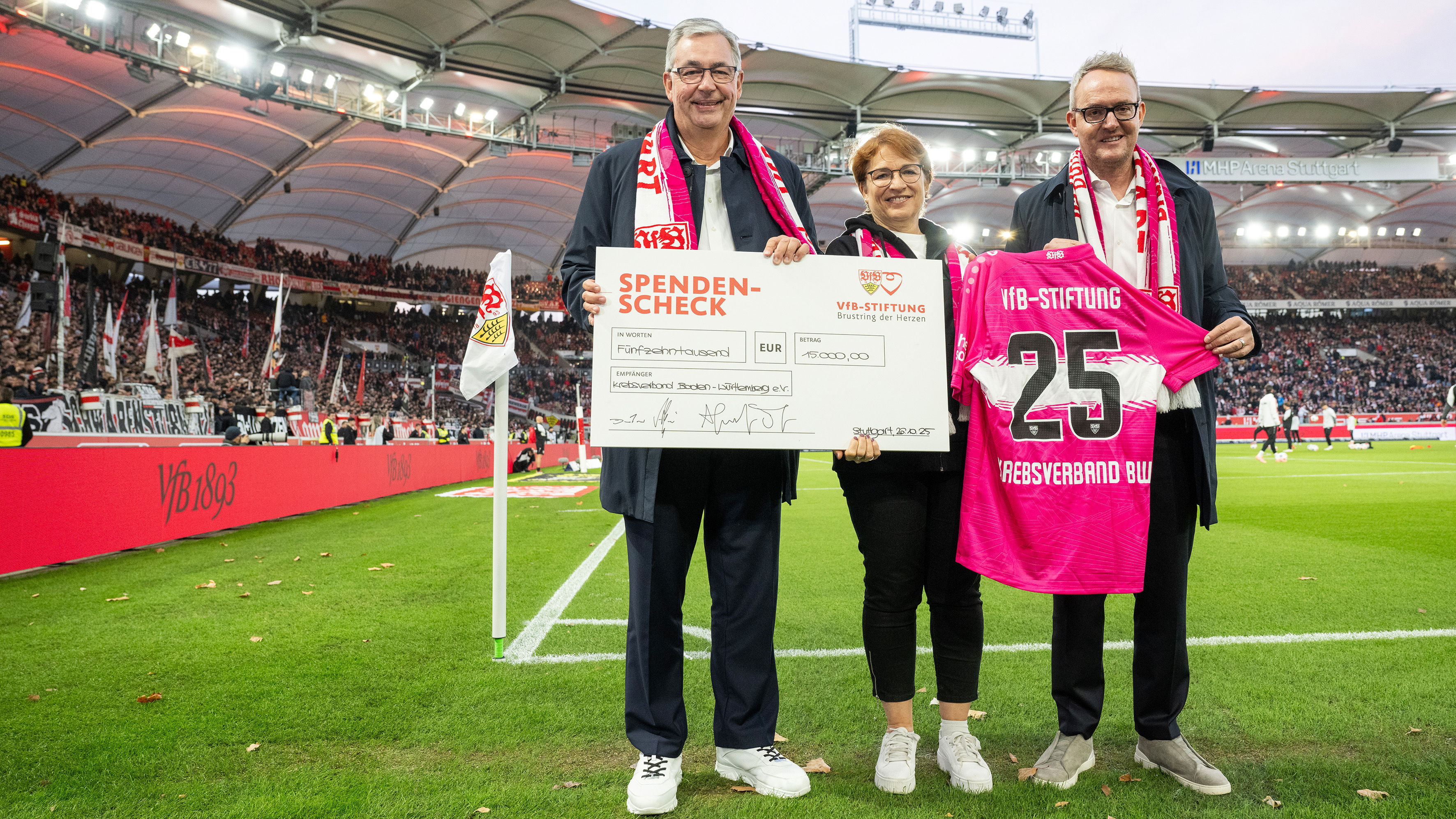 Beim Talk im Sportstudio betonte VfB-Vorstandsvorsitzender Alexander Wehrle mit „Check Dich selbst!“ die Botschaft des Stiftungsspieltags und appellierte an die Zuschauer, auf sich selbst und ihre Liebsten zu achten – durch regelmäßige Checks und die Nutzung der Früherkennungsangebote. Ulrika Gebhardt, Geschäftsführerin des Krebsverbandes Baden-Württemberg, nahm den Ball auf und erläuterte, wie gut Brustkrebs inzwischen heilbar ist: Wird die Krankheit früh erkannt, sind die Heilungschancen hoch, ganz nach dem Motto „Früh erkannt, gut gekontert“. VfB-Präsident Dietmar Allgaier warf einen Blick zurück auf die erfolgreiche Jahrespartnerschaft mit dem Krebsverband Baden-Württemberg und überreichte Gebhardt einen Scheck in Höhe von 15.000 Euro sowie ein pinkfarbenes VfB-Trikot mit Autogrammen.