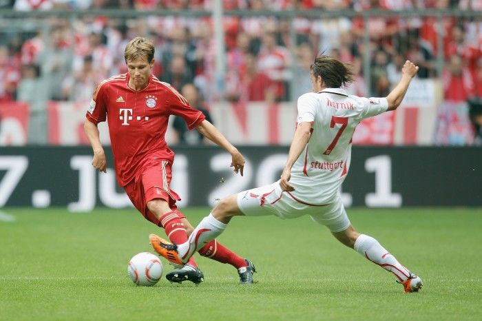 Die erste Hälfte dieses Südgipfels war reich an Höhepunkten. Beide Mannschaften zeigten von Anfang an Offensivfußball vom Allerfeinsten. Hätten die Akteure ihre Fülle an Großchancen besser verwertet, hätte es nach 45 Minuten bereits 3:3 stehen können. Die Zuschauer in der ausverkauften Allianz-Arena, unter ihnen mehr als 6.500 VfB-Fans, kamen jedenfalls voll auf ihre Kosten. Den Anfang machte Zdravko Kuzmanovic mit einem schönen Distanzschuss, den Jörg Butt zur Ecke lenkte. Die Mannschaft mit dem roten Brustring präsentierte sich präsent, wach, aggressiv, läuferisch stark und spielfreudig. Doch auch der Gastgeber ließ sich nicht lumpen und hatte in Arjen Robben einen immer gefährlichen Wirbelwind in seinen Reihen. Der Holländer hatte auch die erste Gelegenheit der Münchner, scheiterte aber nach Zuspiel von Miroslav Klose an VfB-Keeper Sven Ulreich, der kurz darauf auch bei einem Schuss von Klose auf dem Posten war. Wenig später verfehlte Kuzmanovic mit einem Fernversuch das Ziel.