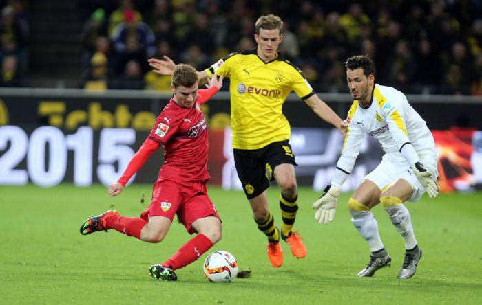 3. Minute: Die Jungs aus Cannstatt erwischen einen denkbar schlechten Start in die Partie. Der Dortmunder Henrikh Mkhitaryan zieht von der Strafraumgrenze ab, Przemyslaw Tyton kann diesen Schuss noch abwehren, den Abpraller köpft aber Gonzalo Castro zur Führung der Gastgeber ins Tor.