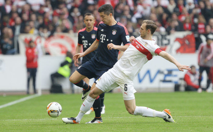 31. Minute: Und dann gerät die Mannschaft von Jürgen Kramny unglücklich in Rückstand. Nach einer scharfen Hereingabe von Bayerns Franck Ribery will Georg Niedermeier vor dem heranstürmenden Robert Lewandowski klären und trifft ins eigene Tor.