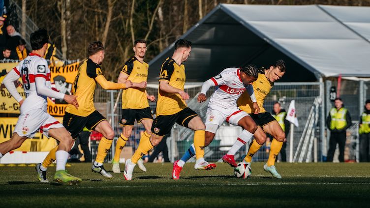 Neuzugang Jannik Hofmann feierte gegen die SG Dynamo Dresden sein Startelf-Debüt für den VfB. Vor 6.150 Zuschauern in der WIRmachenDRUCK Arena übernahmen anfangs die Gäste die Spielkontrolle. Wirklich gefährlich wurde Dynamo gegen konzentriert verteidigende Jungs aus Cannstatt jedoch nicht. So blieb die Partie ein ausgeglichenes und ereignisarmes Duell – bis zum Ende der ersten Hälfte. In Minute 38 brachte Laurin Ulrich den VfB mit der ersten guten Möglichkeit direkt in Führung. Wenig später hatten Jannik Hofmann ebenfalls per Fernschuss (42.) und Mo Sankoh weitere Abschlusschancen, es blieb aber beim nicht unverdienten 1:0-Zwischenstand nach 45 Minuten.