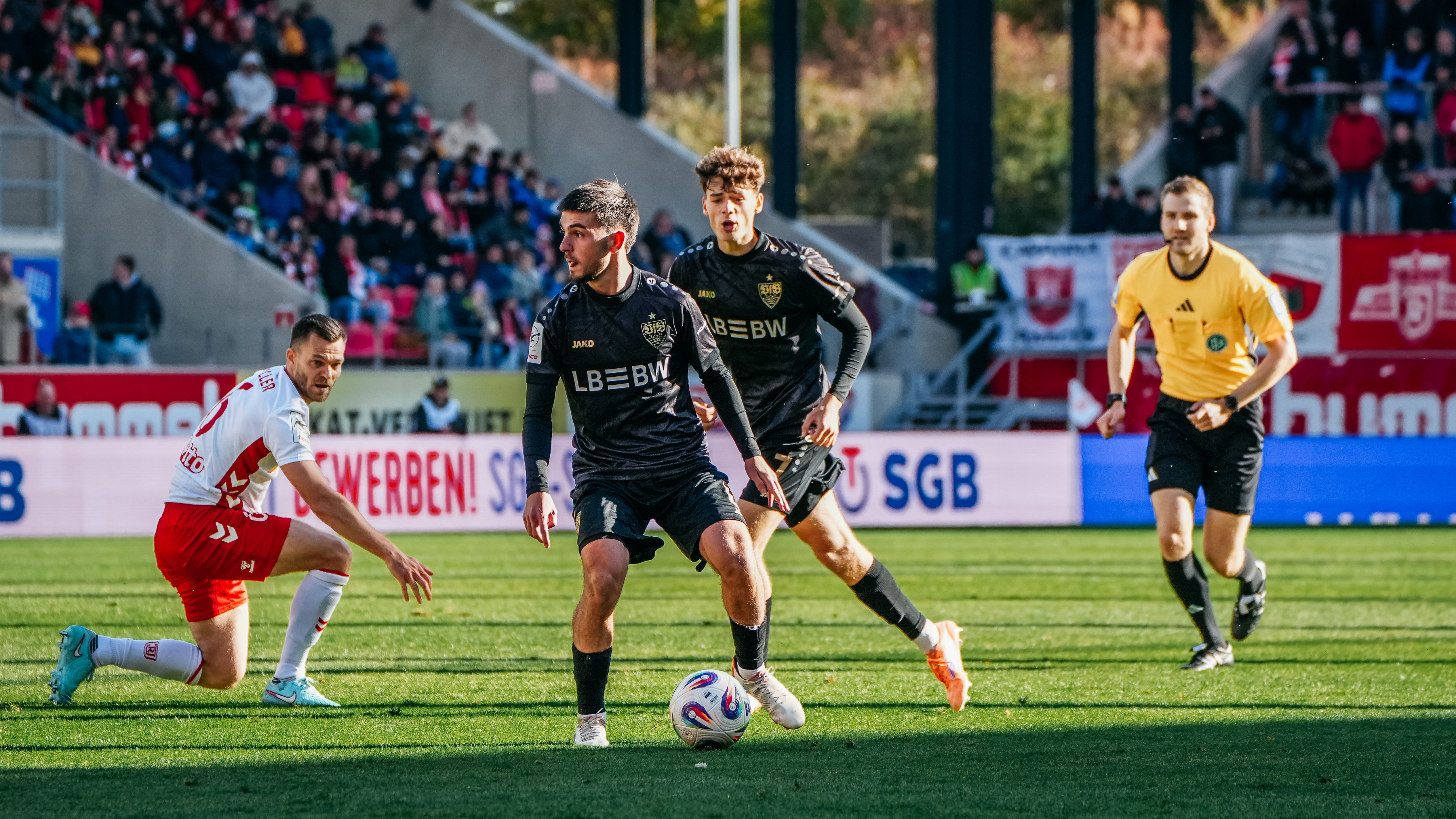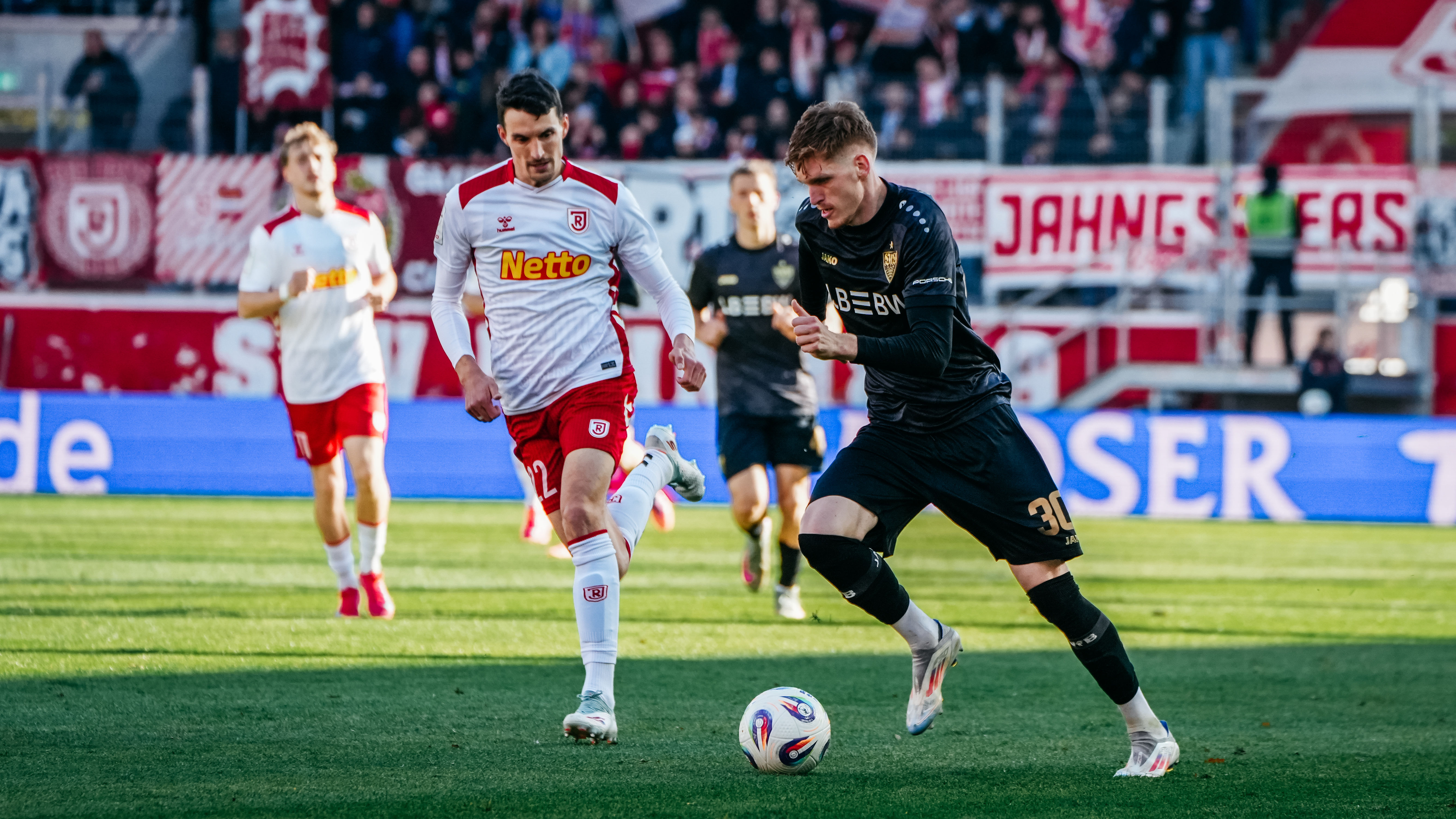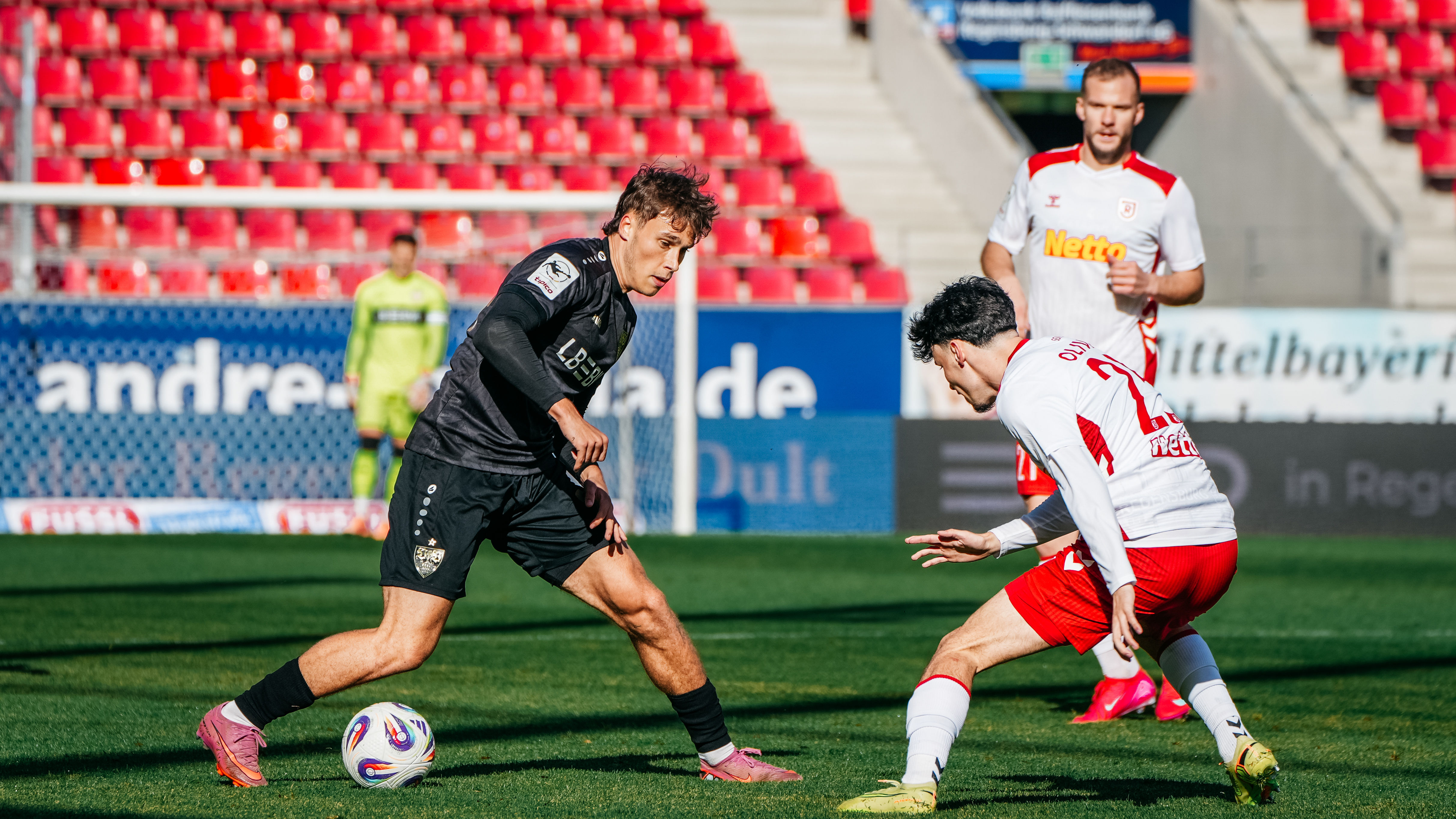 Es dauerte nicht einmal 30 Sekunden, da hatte der VfB bereits die erste gute Chance der Partie, als es Noah Darvich versuchte, der Schuss aber von SSV-Keeper Felix Gebhardt pariert wurde. In Minute acht ging die Direktabnahme von Yannik Keitel nur knapp am Pfosten des Jahn vorbei. In der Folge kamen dann die Gastgeber vor 7379 Zuschauern im Jahnstadion besser in die Partie und wurden auch gefährlich. Erst blieb Keeper Dominik Draband im Eins-gegen-Eins-Duell gegen Lucas Hermes der Sieger (11.), wenig später klärte Draband auch den Kopfball von Felix Strauss. Mitte der ersten Hälfte übernahm dann das Team aus Cannstatt wieder das Kommando und ging nach gut einer halben Stunde durch Mansour Ouro-Tagba in Führung (31.; siehe: Die Tore). Kurz vor der Pause legte der VfB sogar nach, als Noah Darvich per Elfmeter zum 0:2 traf (44.).