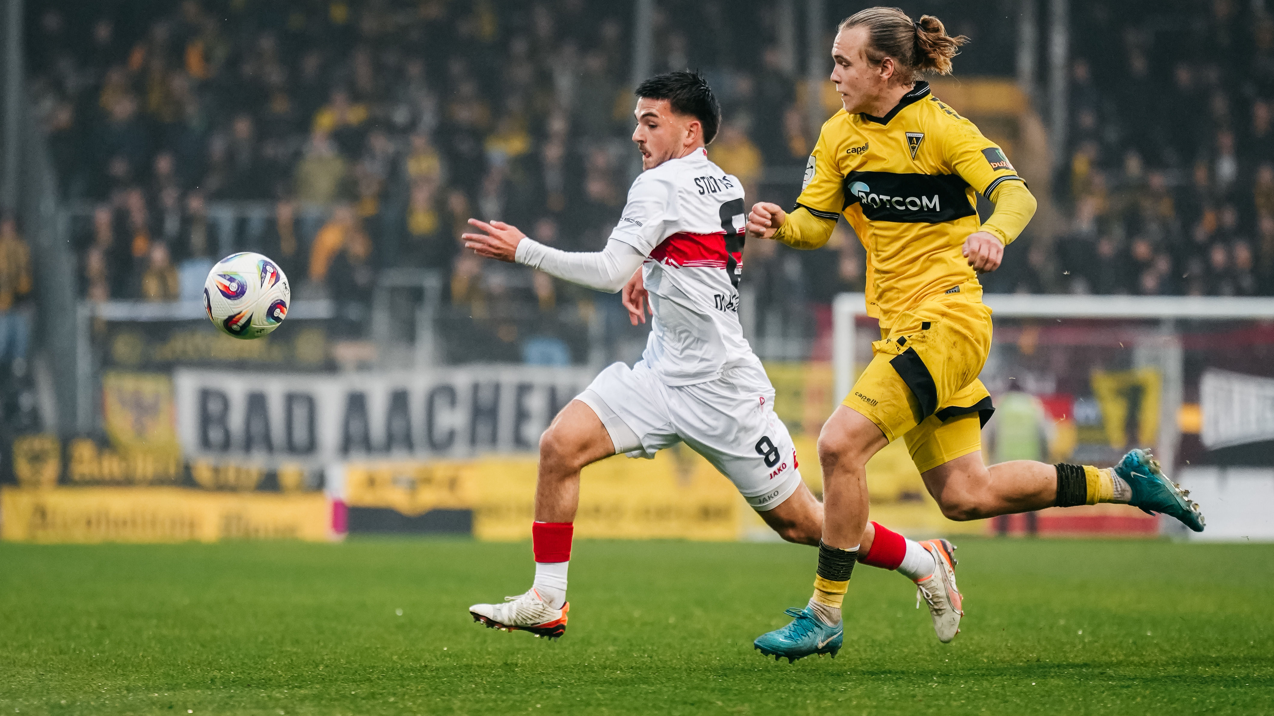Hälfte zwei begann aus VfB Sicht schwungvoll. Immer wieder wurden die Jungs aus Cannstatt nach Standardsituationen oder Hereingaben von außen gefährlich, klare Abschlüsse gab es bis auf einen Fernschuss von Yanik Spalt (62.) aber lange Zeit nicht. In der Schlussphase wurden die Angriffe des VfB konkreter. Erst scheiterte der eingewechselte Abdenego Nankishi an TSV-Keeper Olschowsky (77.), dann setzte Nicolas Sessa den Ball aus guter Position drüber (80.). Aachen verteidigte bis zum Ende konsequent und entschied in der fünften Minute der Nachspielzeit mit dem 1:3 die Partie. So setzten sich effiziente Gäste (sechs Torschüsse) gegen eine spielerisch überlegene (18 Torschüsse), aber nicht immer zwingend gefährliche U21 mit 3:1 durch.
