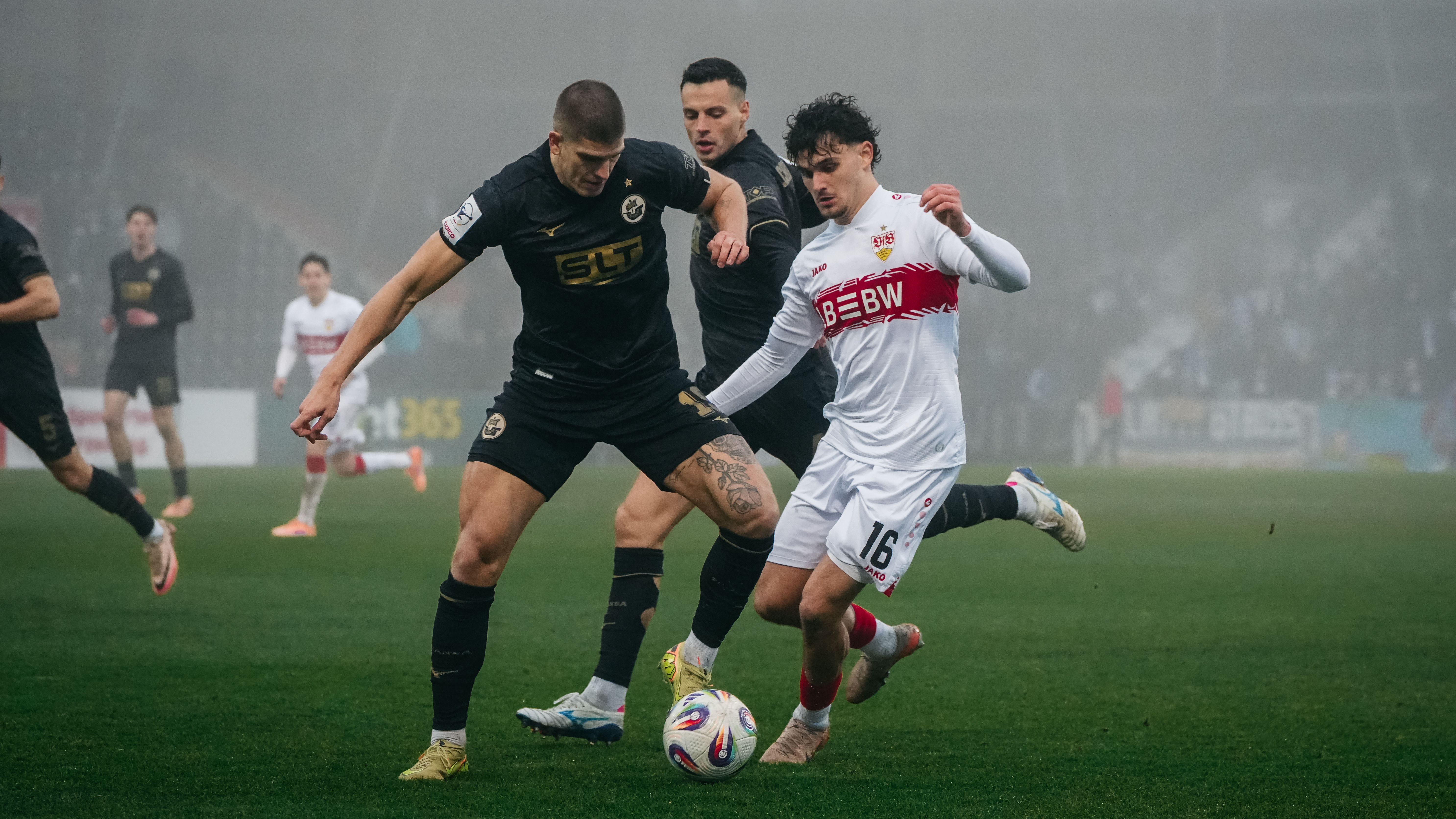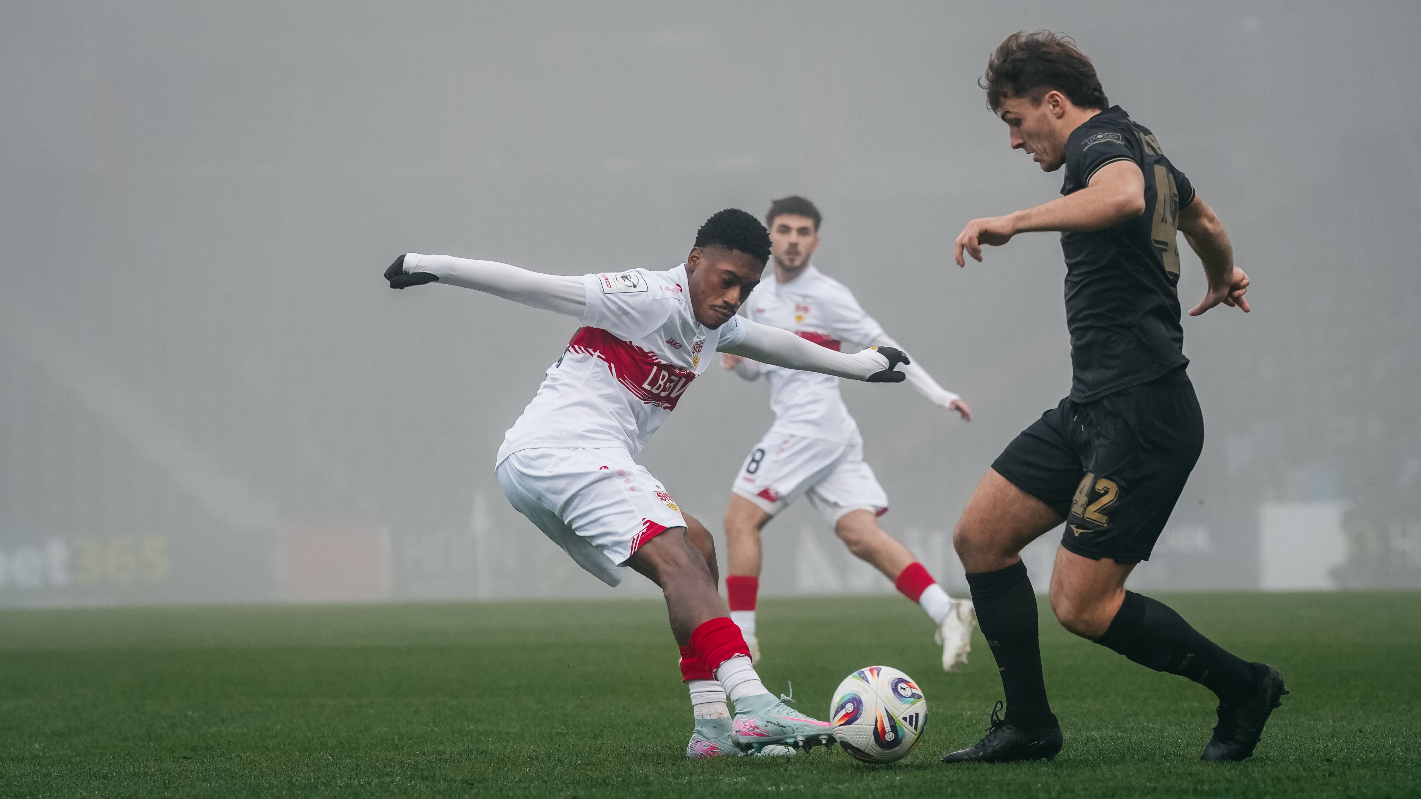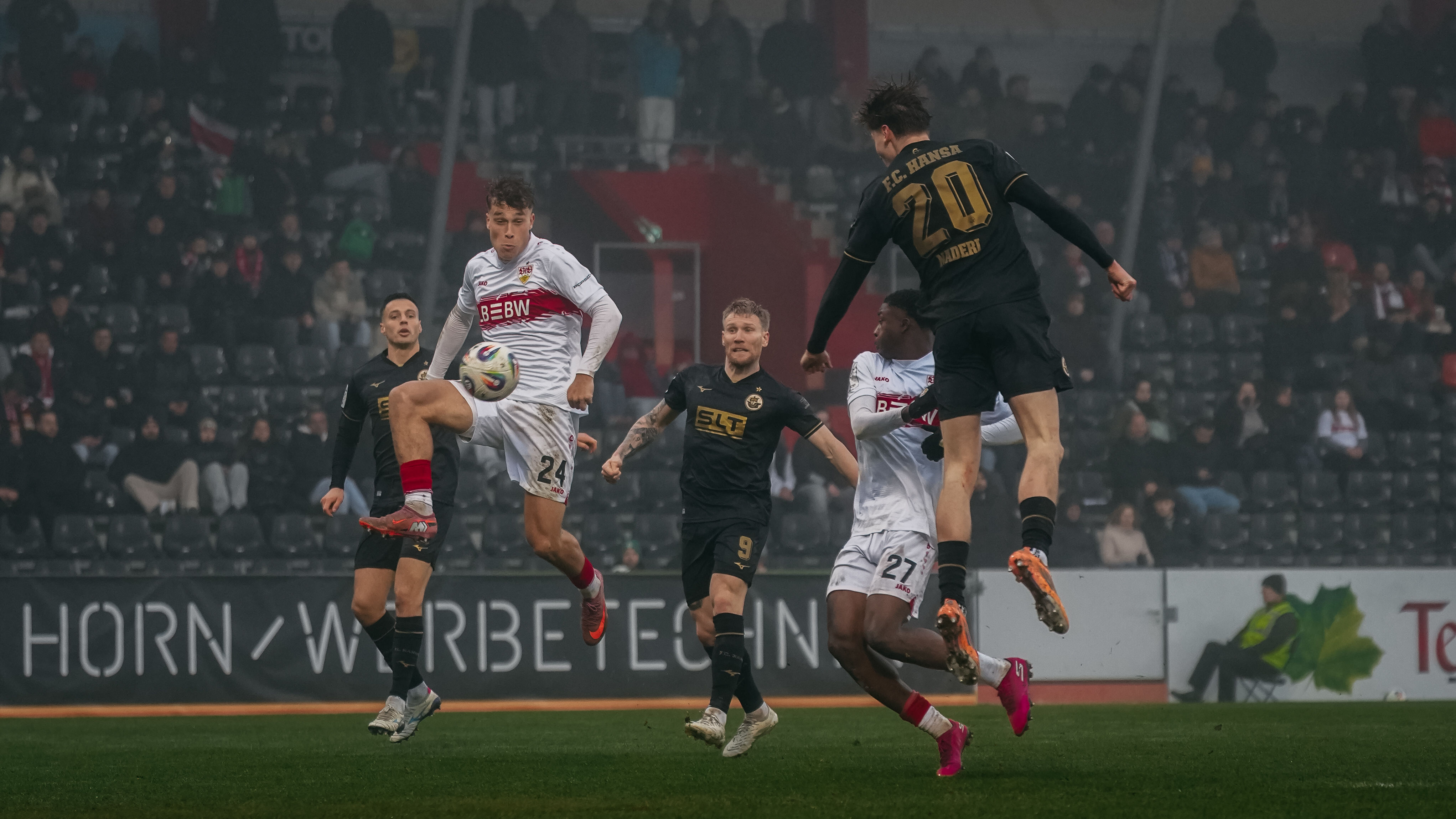 Vor 3.160 Zuschauern in der WIRmachenDRUCK Arena benötigte die Partie keine Abtastphase. In der fünften Minute ließ Rostocks Benno Dietze die Latte erzittern, im direkten Gegenzug war Justin Diehl auf und davon, kam gegen Benjamin Uphoff im Hansa-Tor allerdings nicht richtig zum Abschluss, sodass die Chance verpuffte. Eine Minute später hatte Diehl die nächste Gelegenheit, sein Schuss aus elf Metern wurde aber zur Ecke geblockt. In der Folge hatte der VfB die Partie weitestgehend unter Kontrolle, ohne jedoch die ganz große Durchschlagskraft zu entwickeln. So ging es torlos in die Pause.