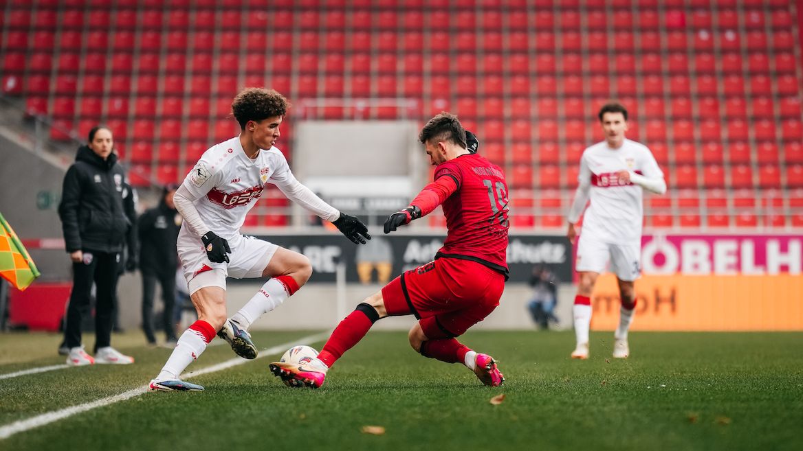 Den besseren Start in die zweite Hälfte erwischten die Schanzer. In Minute 47 klatschte eine abgerutschte Flanke von Marcel Costly an den Pfosten, eine Minute später stellte Dennis Kaygin auf 2:1 für den FC Ingolstadt. Danach übernahm sofort der VfB wieder die Initiative und erspielte sich bis zum Ende ein großes spielerisches Übergewicht, münzte dies allerdings zu selten in Torgefahr um. In Minute 56 fand der eingewechselte Lauri Penna mit seinem Fernschuss nicht den Weg ins Ziel, zwei Minuten später schoss Noah Darvich einen kurz vor der Linie liegenden Gegenspieler an, in Minute 70 ging der Kopfball von Dominik Nothnagel am Tor vorbei. In der Schlussphase hatte Mo Sankoh den Ausgleich auf dem Fuß, der Angreifer bekam bei seinem Versuch allerdings nicht genügend Druck hinter den Ball, sodass FCI-Keeper Eisele parieren konnte (84.). Bis zum Schluss schnürten die Jungs aus Cannstatt den FCI mit „Power-Play“ tief in der eigenen Hälfte ein, die zahlreichen Flanken, Ecken und Schüsse aus der zweiten Reihe blieben aber letztlich ohne Ertrag. Als dann auch der letzte Versuch von Abed Nankishi in der fünften Minute der Nachspielzeit über das Tor gegangen war, besiegelte Schiedsrichter Timon Schulz mit dem Schlusspfiff eine ärgerliche 1:2-Niederlage der U21.