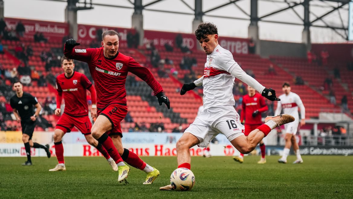 Vor 3.008 Zuschauern im Audi-Sportpark benötigte die Partie keine lange Abtastphase, um Aufreger zu bieten. Den ersten Abschluss hatte der FCI durch Dennis Kaygin, den der VfB blocken konnte (8.), ehe die erste Großchance auf das Konto der Jungen Wilden ging: Mansour Ouro-Tagba wurde mustergültig von Noah Darvich freigespielt, sein Abschluss aus spitzem Winkel ging aber nur an die Latte (11.). Weitere drei Minuten später war der VfB im Glück, dass Julian Kügel einen verunglückten Rückpass nicht zum 1:0 verwerten konnte, sondern seinen Lupfer am Tor vorbeisetzte. In der Folge beruhigte sich das Geschehen wieder ein wenig, ehe Stefan Drljaca mit einem starken Reflex gegen Marcel Costly den Rückstand verhinderte (30.). Eine Minute später war der Schlussmann dann aber machtlos, als Simon Lorenz die darauffolgende Ecke zum 1:0 einköpfte (siehe: Die Tore). Die Antwort des Brustring-Teams? Postwendend! Sekunden nach Wiederbeginn traf Noah Darvich zum 1:1. Mit diesem Zwischenstand ging es in die Pause.