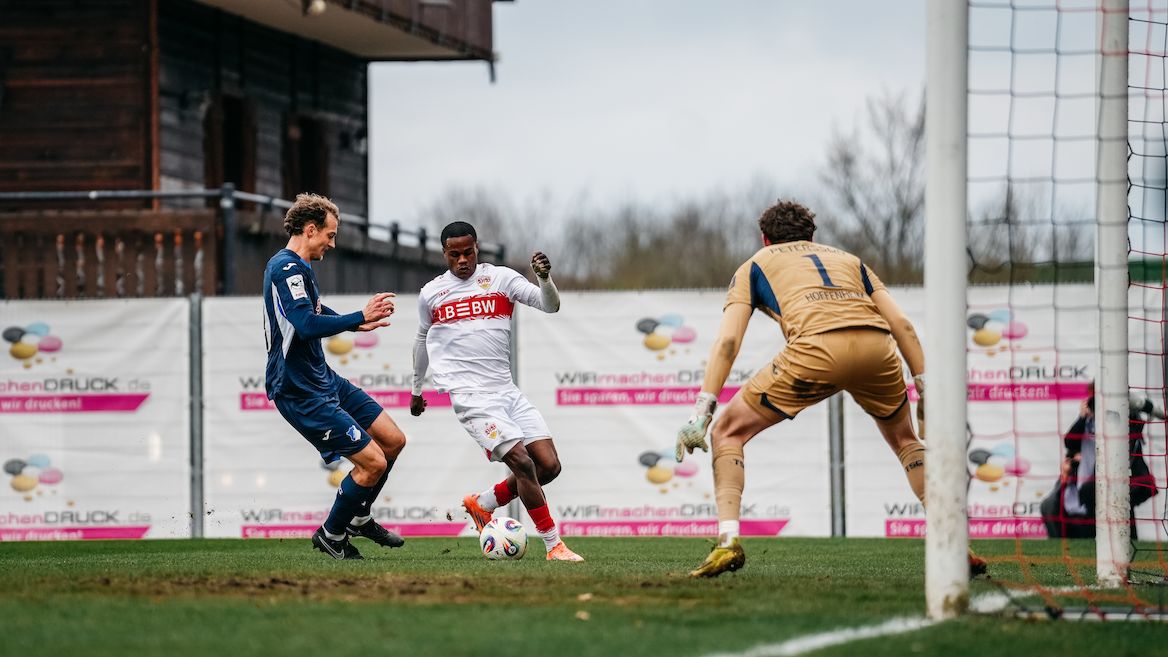 Im Duell der „Zweiten“ dominierte der VfB die erste Hälfte nahezu über die komplette Distanz und erarbeitete sich ein deutliches Chancenplus. Allerdings war die Chancenverwertung das große Manko. Samuele Di Benedetto (7.), Mansour Ouro-Tagba (15.), Justin Diehl (17.), ein Beinahe-Eigentor von Kelven Frees (20.), Noah Darvich (26.) – alles gute Chancen, keine ging rein. Die beste hatte Mansour Ouro-Tagba in Minute 35, als er nach Foul an Mirza Catovic zum Elfmeter antrat, allerdings an TSG-Keeper Petterson scheiterte. Erst gegen Ende der ersten Hälfte erspielte sich Hoffenheim erste gute Möglichkeiten, bei den Versuchen von Eduardo (41.) und Zeitler (45.) war aber stets VfB-Schlussmann Florian Hellstern zur Stelle. So ging es mit einem aus Gäste-Sicht schmeichelhaften 0:0 in die Pause.