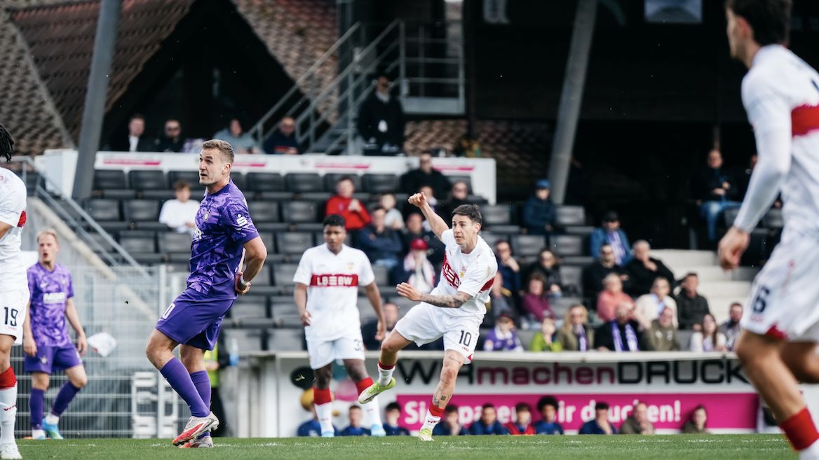 54. Minute: Ein tiefer Ball von Marcel Bär auf Julian Guttau brachte den Offensivspieler links im Strafraum in Position. Sein noch etwas abgefälschter Schuss schlug unhaltbar für Flo Hellstern im VfB-Kasten ein.