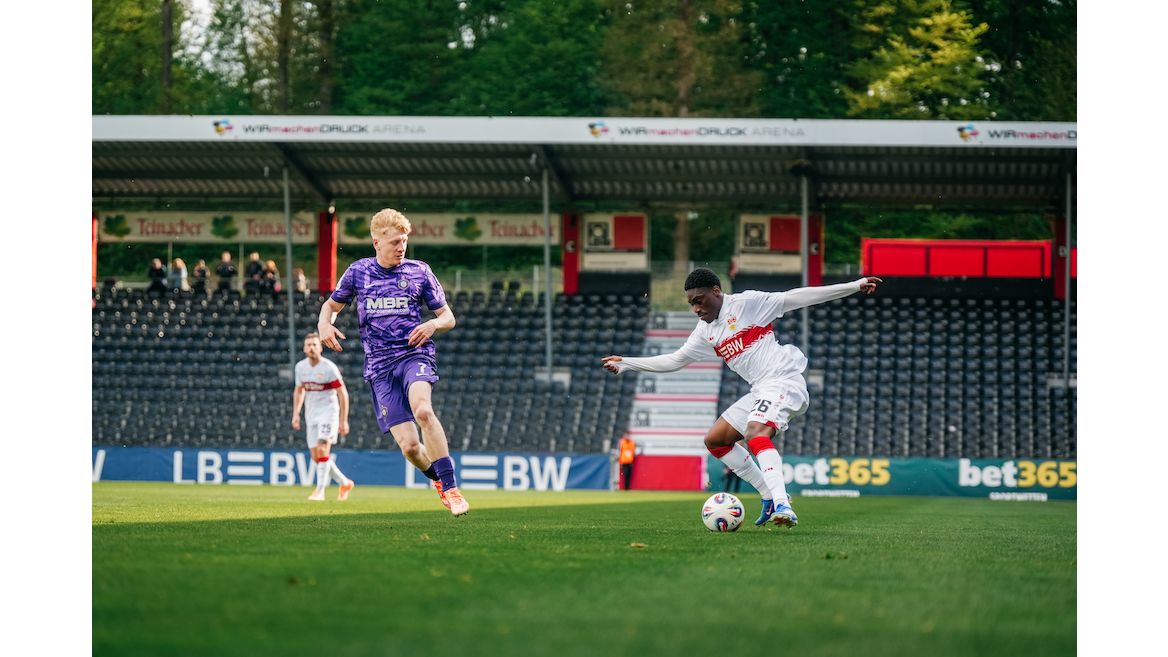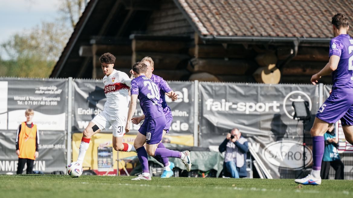 Durchgang zwei begann auf VfB-Seite mit einem Doppelwechsel. Yanik Spalt und Samuele di Benedetto ersetzten Leny Meyer und Julian Lüers. Am Spiel änderte sich derweil wenig. Die Mannen mit dem roten Brustring waren zunächst weiter tonangebend, doch das Team von Aues Interimstrainer Khvicha Shubitidze wurde mit fortlaufender Zeit etwas zielstrebiger. Und kam nach 54 Minuten zum Anschluss, als der auffälligste Gäste-Spieler, Julian Guttau, links in den Strafraum zog und nicht lange fackelte. Sein von Christopher Olivier noch leicht abgefälschter Schuss schlug letztlich unhaltbar für Flo Hellstern zum 2:1 ein. Aue war in der Folgezeit präsenter als in Durchgang eins, doch die U21 hielt mit viel Wille und Laufbereitschaft dagegen und kontrollierte über weite Strecken der Partie das Geschehen. So blieben klare Torchancen hüben wie drüben über einen längeren Zeitraum Mangelware. Erst eine knappe Viertelstunde vor dem Ende bot sich Justin Diehl per Kopf die Chance auf ein weiteres Tor, doch Martin Männel hatte etwas dagegen und parierte souverän. Eine Unachtsamkeit der VfB-Hintermannschaft brachte knapp zehn Minuten vor Schluss Aues Kapitän Marcel Bär eine Möglichkeit ein, doch Flo Hellstern zeigte sich hellwach und verhinderte Schlimmeres. Auf der Gegenseite musste Martin Männel bei einem Versuch von Justin Diehl (84.) noch einmal sein ganzes Können aufzeigen. Eine Hereingabe des eingewechselten Jonah Fabisch sprang drei Minuten vor Schluss dann Alex Groiß im Strafraum unglücklich an die Hand, so dass es Elfmeter für die Veilchen gab. Marcel Bär verwandelte mit etwas Glück zum 2:2, denn Flo Hellstern hatte die Ecke geahnt, konnte den Ausgleich aber trotzdem nicht mehr verhindern. Am Ende konnte das Willig-Team dann sogar froh sein, wenigstens einen Punkt mitzunehmen. Denn ein abgefälschter Versuch von Herwerth rauschte in der Nachspielzeit am Auer Kasten vorbei und im Gegenzug vergab dann Bär freistehend eine Großchance, so dass es letztlich beim 2:2 blieb.