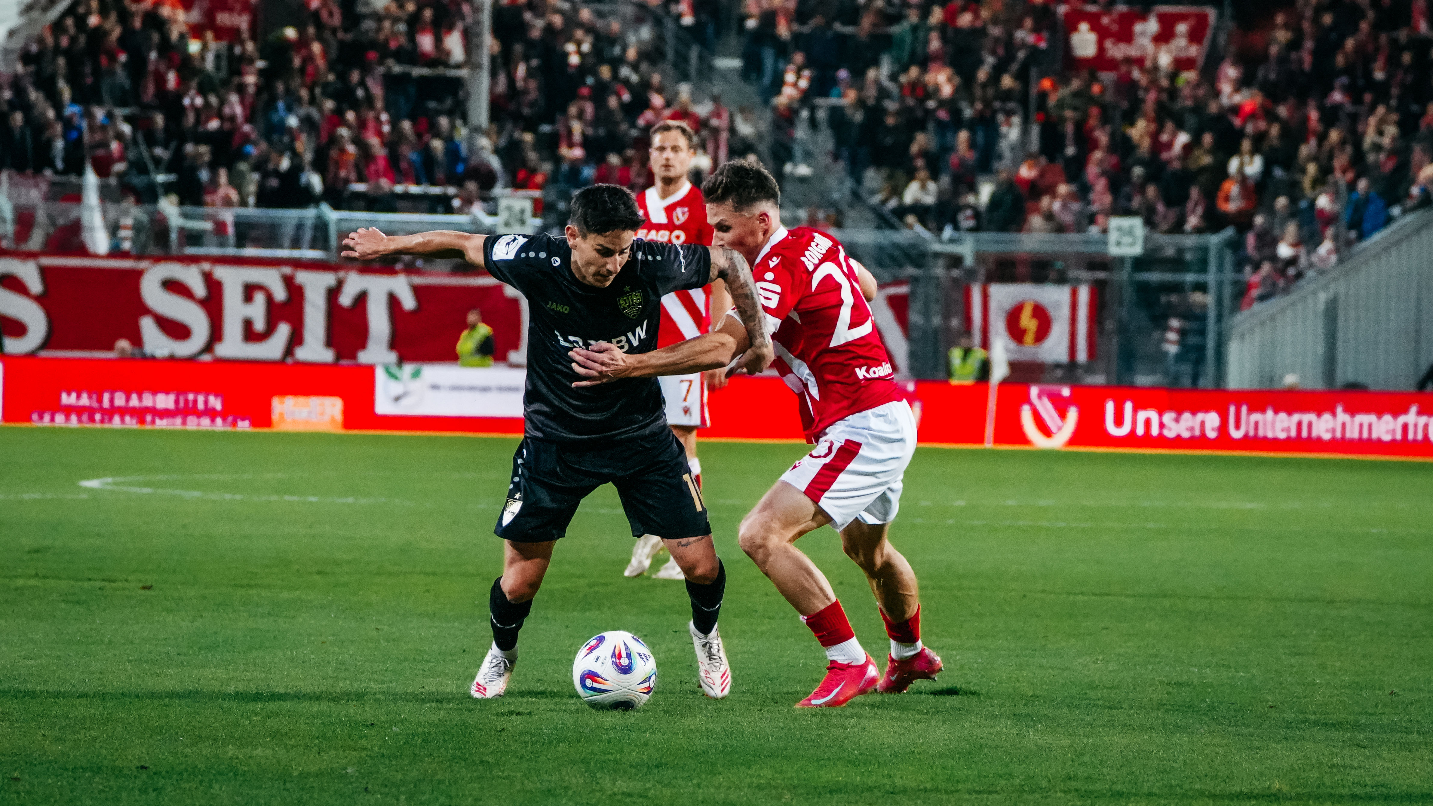 Das Spiel begann aus VfB Sicht mit einem Schreckmoment gleich in der ersten Minute, als Energies Timmy Thiele VfB Keeper Stefan Drljaca (für den weiter angeschlagenen Florian Hellstern im Tor) überlupfte, aber das Tor knapp verfehlte. In Minute fünf ging der FCE dann durch Erik Engelhardt in Führung. Der VfB braucht einige Minuten, um ins Spiel zu finden, und musste in dieser Phase auch einige gefährliche Angriffe der Hausherren (8., 19.) überstehen. In Minute 38 ergab sich dann die große Chance zum Ausgleich: Mo Sankoh war seinem Gegenspieler enteilt und war nach schönem Steilpass allein vor Cottbus-Keeper Funk, der allerdings als Sieger aus dem Duell hervorging. Eine Minute später wehrte Funk den Fernschuss von Samuele Di Benedetto zur Ecke ab. Just in dieser Phase, als der VfB gute offensive Akzente setzen konnte, erhöhte Cottbus durch einen unhaltbar abgefälschten Freistoß von Henry Rorig auf 2:0. Dies war auch der Pausenstand.