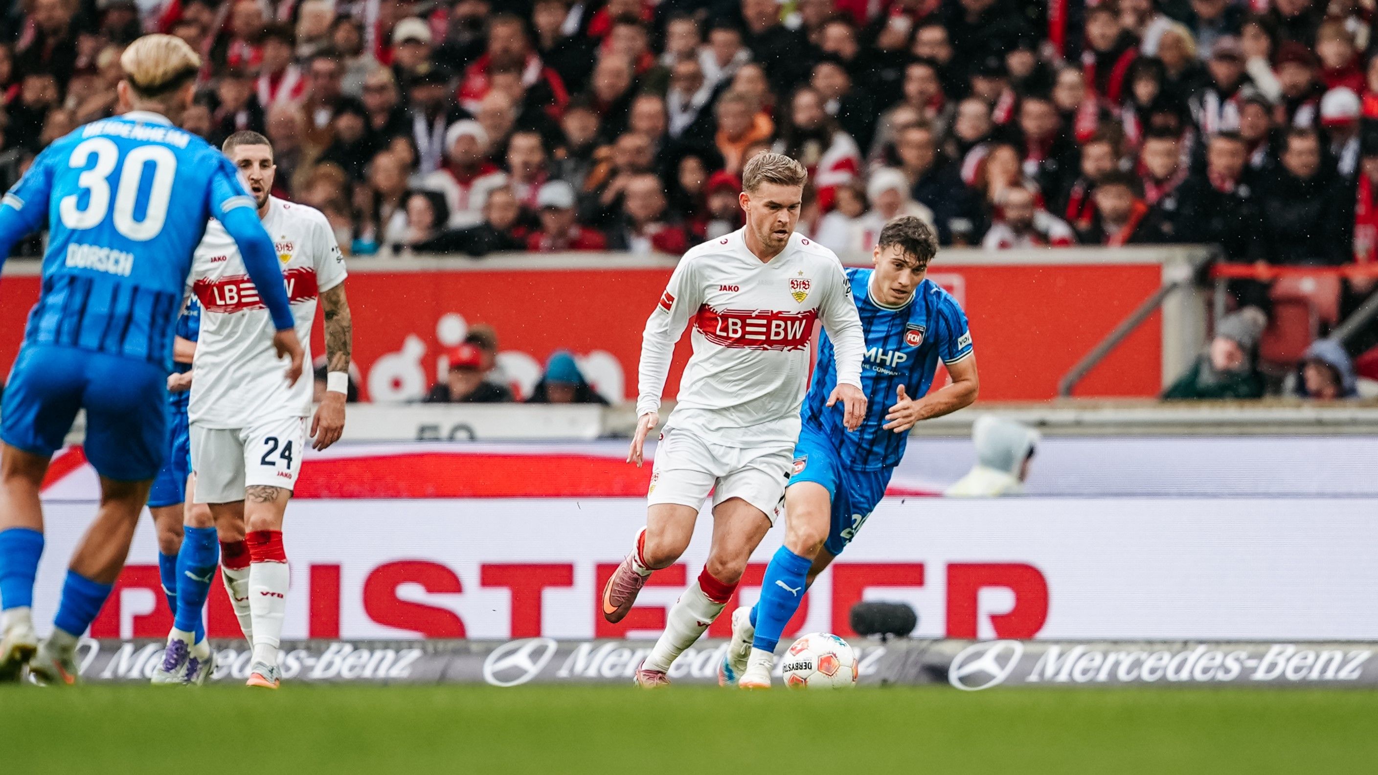 Eine Begegnung von zwei Clubs, die nur 72 Kilometer voneinander entfernt liegen. Der VfB empfing am Sonntagnachmittag in der mit 60.000 Fans ausverkauften MHP Arena den 1. FC Heidenheim. In den bisherigen vier Bundesliga-Partien gewannen die Jungs aus Cannstatt nur einmal gegen die Gäste von der Ostalb. „Man muss gegen Heidenheim immer gewarnt und gewappnet sein“, hatte Sebastian Hoeneß vor der Begegnung gesagt. Im Vergleich zur UEFA Europa League-Niederlage am Donnerstagabend beim FC Basel (0:2) veränderte der Cheftrainer seine Startaufstellung auf drei Positionen: Jeff Chabot, Atakan Karazor und Bilal El Khannouss begannen. Ramon Hendriks, Angelo Stiller und Tiago Tomás nahmen zunächst auf der Bank Platz. Der VfB fand schnell seine Struktur.