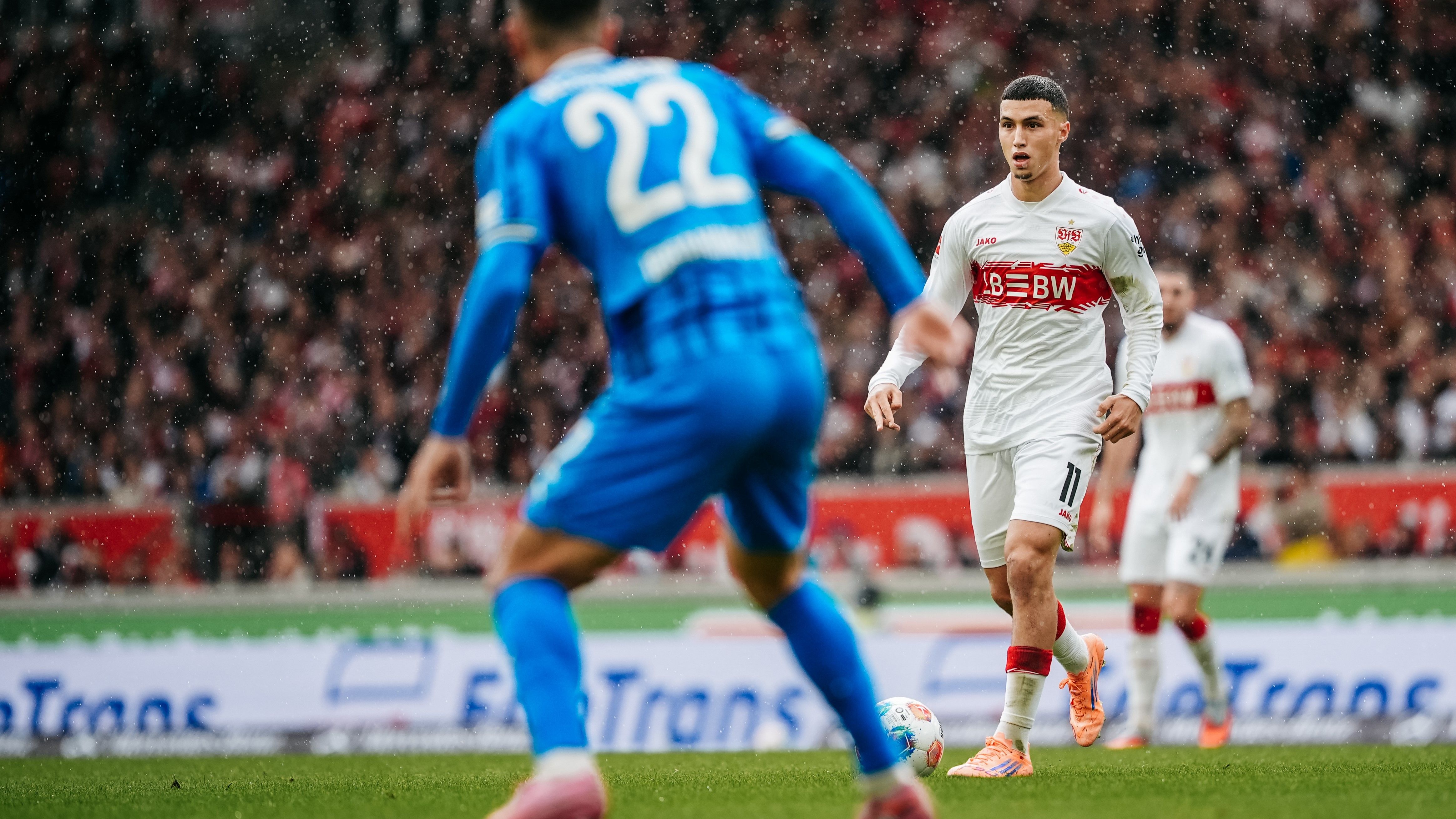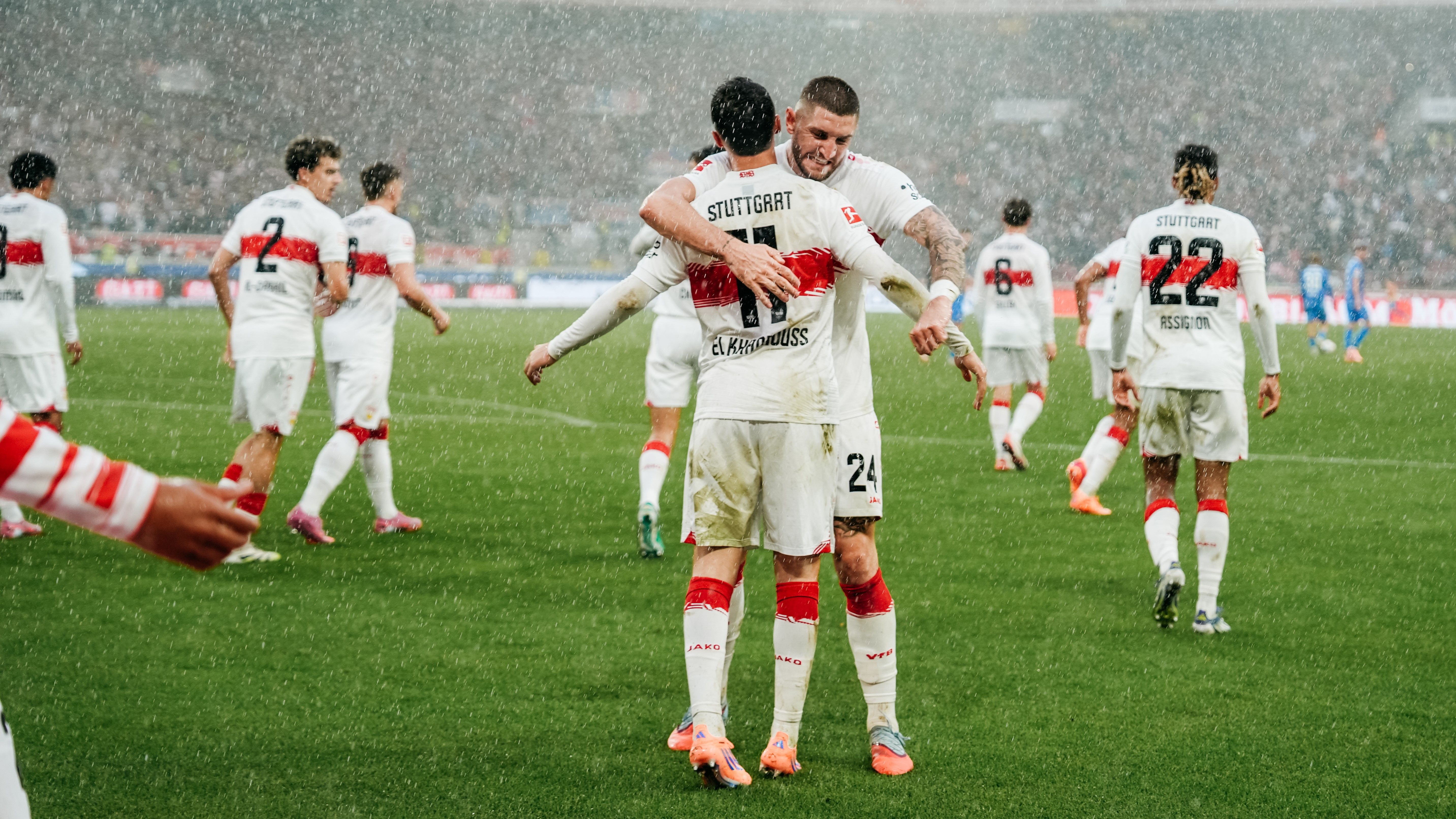 Und verzeichnete die ersten Ansätze. Badredine Bouanani schoss aus spitzem Winkel am langen Pfosten vorbei, Jamie Leweling verzog aus zentraler Position, Jeff Chabot versuchte es via Aufsetzer (6. Minute/22./30.). Inzwischen setzten immer wieder Schauer ein, der FCH agierte defensiv mit Fünferkette und überließ dem Team mit dem roten Brustring zumeist den Ball. Die Folge? Stuttgart musste die richtige Mischung finden aus Offensive und Konterabsicherung. Das gelang vor allem in Bezug auf die Abwehrarbeit, der VfB blockte die Heidenheimer Gegenstöße oft ab – offensiv fehlte es dagegen an Großchancen. Halbzeitstand: 0:0.