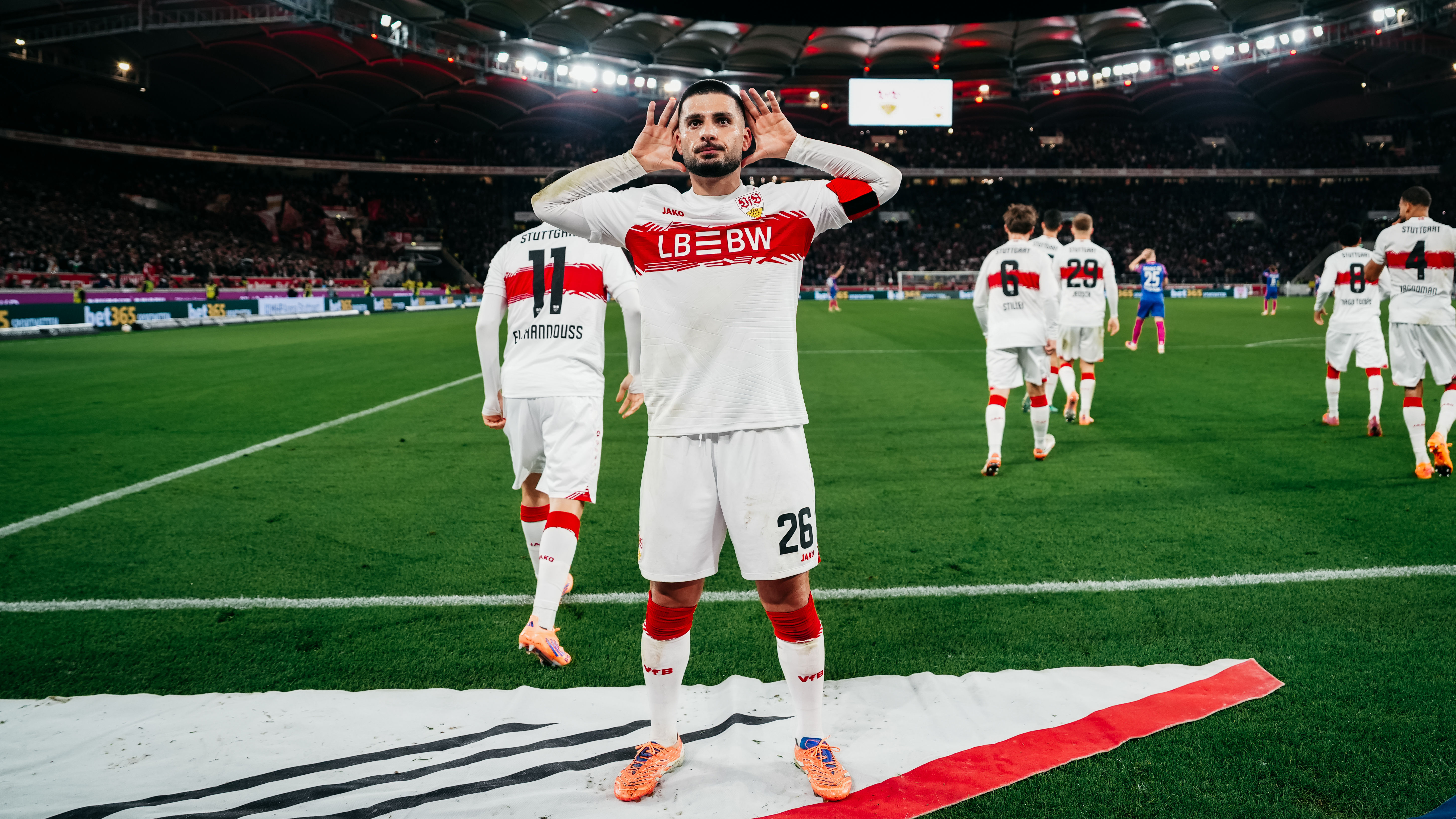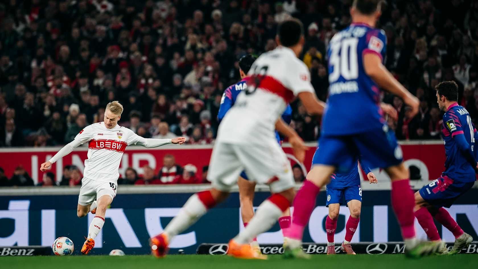 45.+3 Minute: In der Nachspielzeit der ersten Halbzeit gleicht der VfB aus. Josha Vagnoman passt zu Chris Führich, der nach innen dribbelt und aus circa 23 Metern abschließt. Der Ball dreht sich ins lange Eck, 1:1.