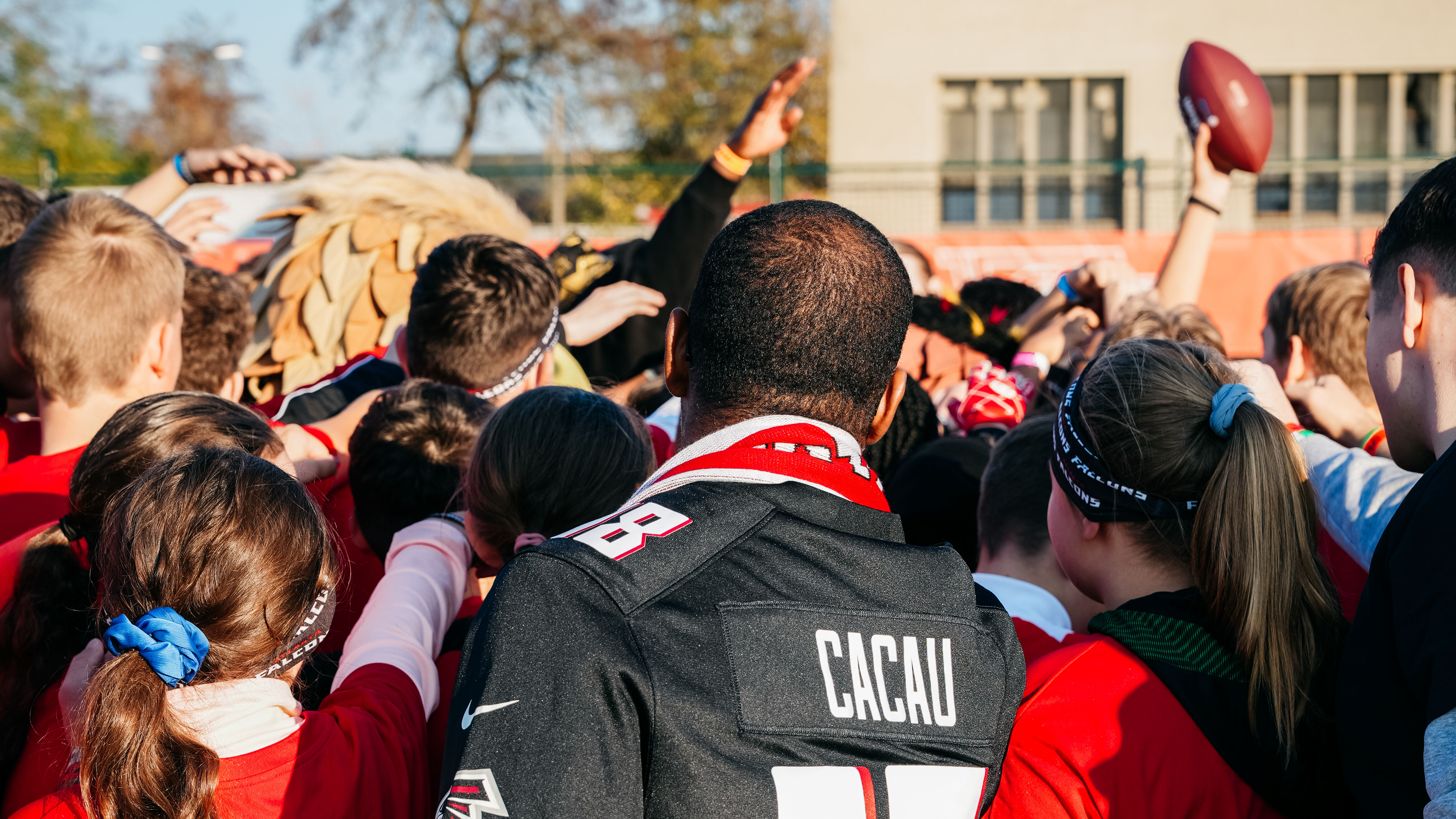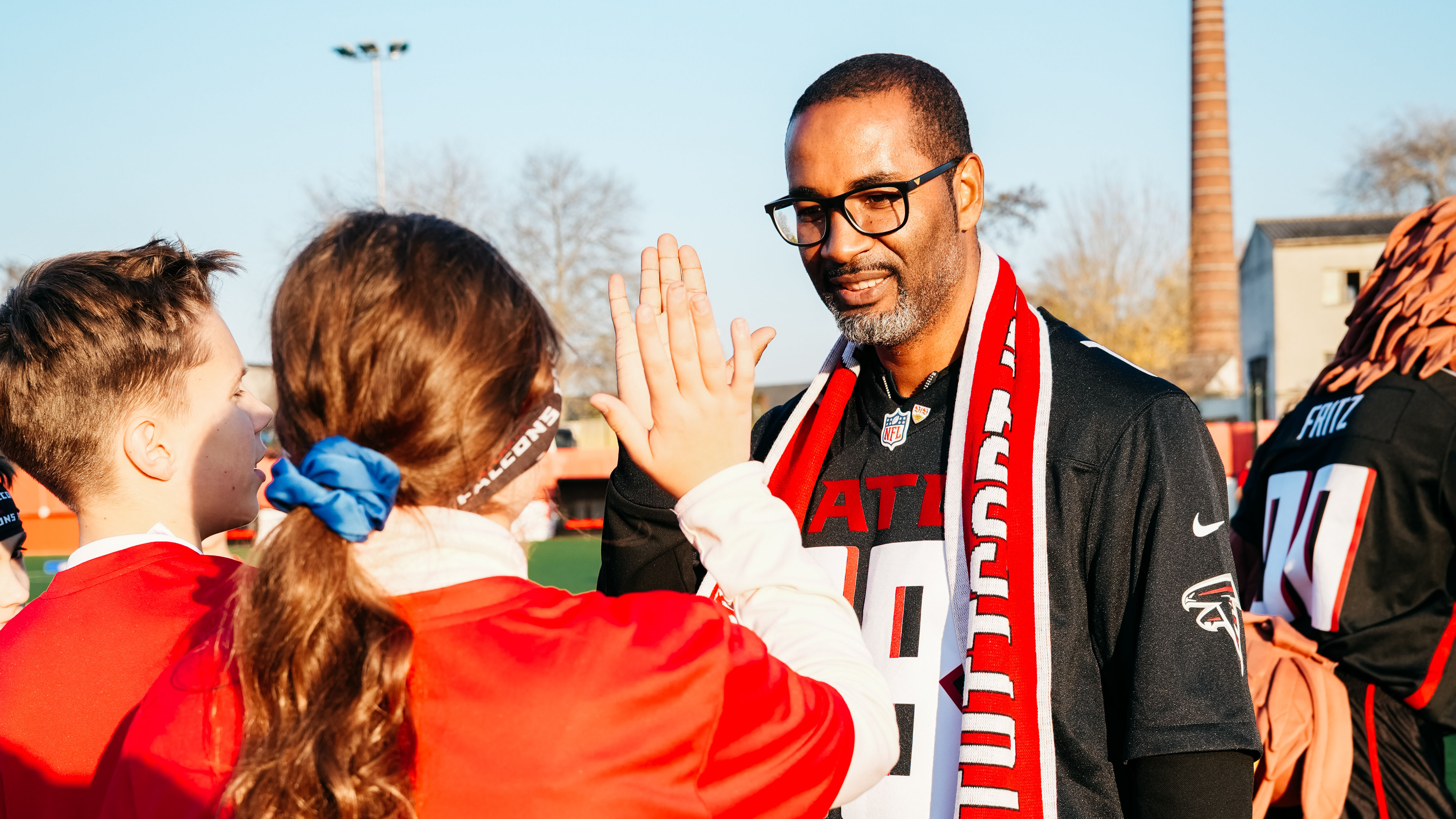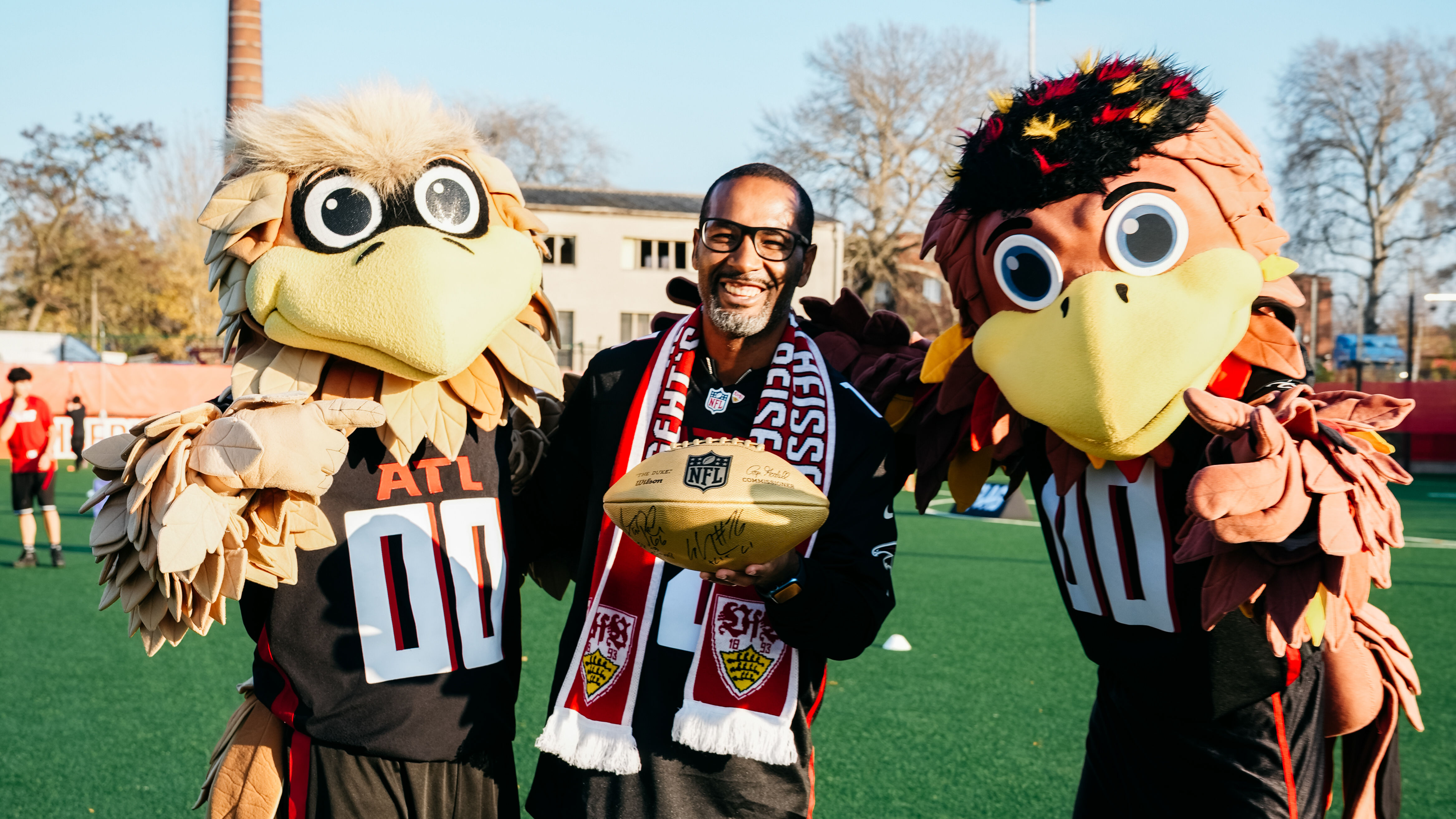 The Falcons’ involvement in this year’s NFL Germany Games was the perfect opportunity to further cement the close ties between the two parties, with Cacau travelling to Berlin on Friday to take part in the Falcons’ fan activities ahead of their encounter with the Indianapolis Colts. At the Falcons Flag Football Clinic, the 44-year-old managed to get his own hands on the ball and meet Falcons legends Jessie Tuggle and Todd McClure.
